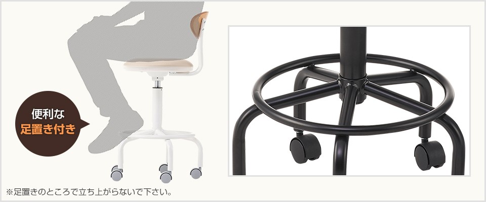 高い位置でも落ち着いて座れるリング型足置き付き。360度対応して使いやすく、どの位置でも足を置くことができます。