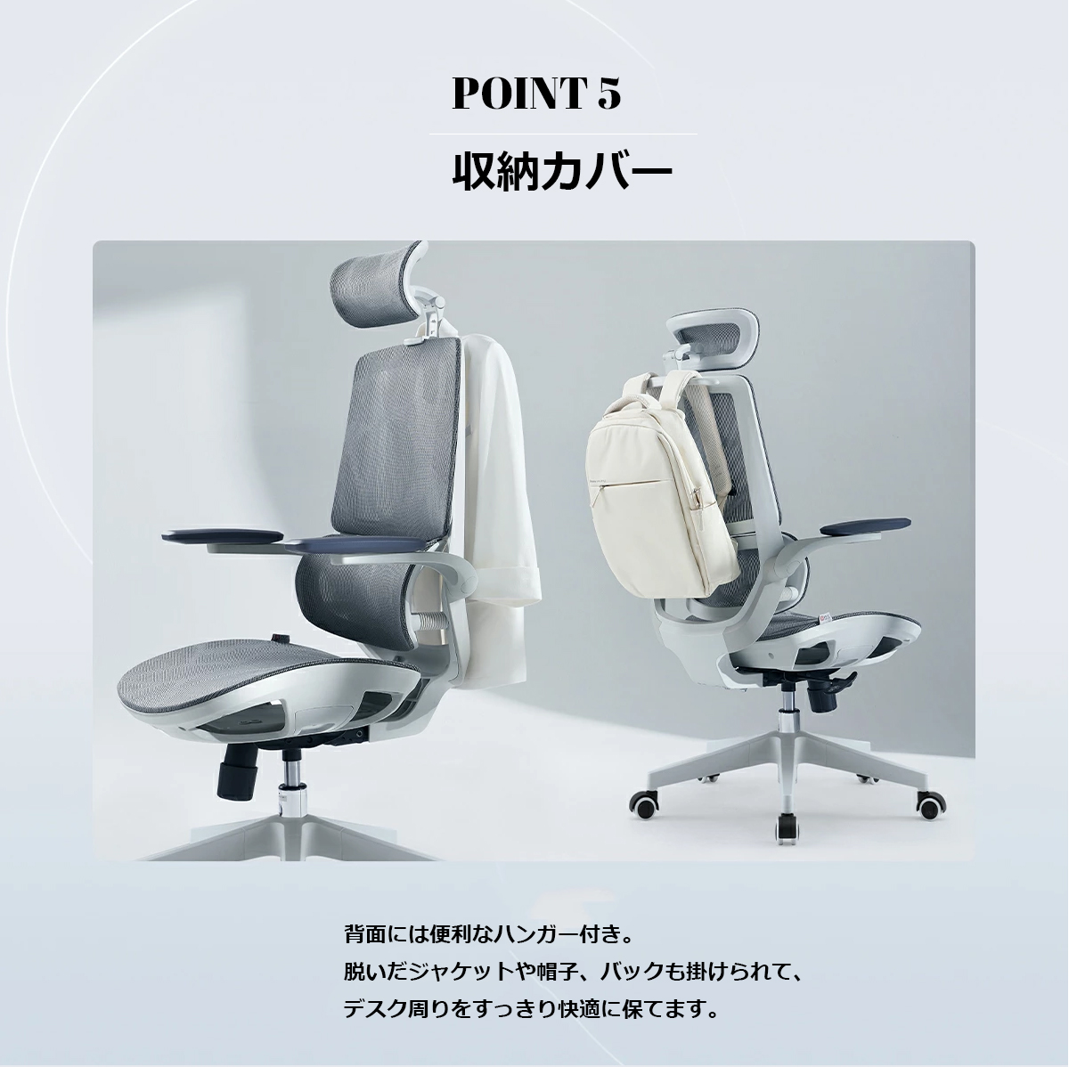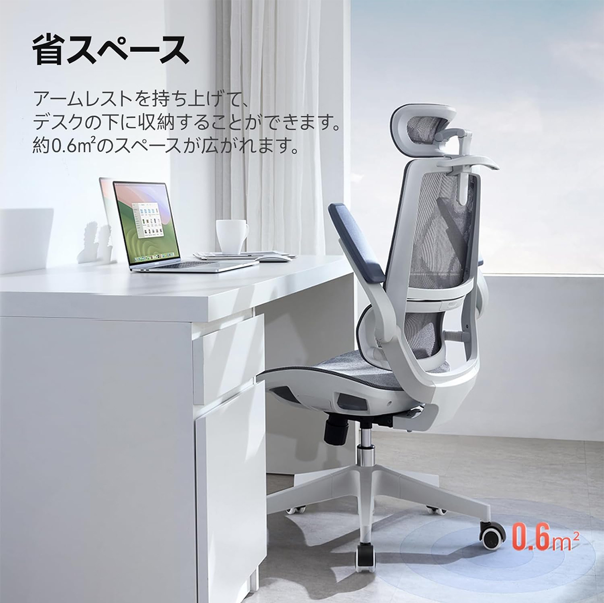 省スペース設置:肘置きを約90°跳ね上げて、デスクの中まで収納できます。ハンガーバー付き