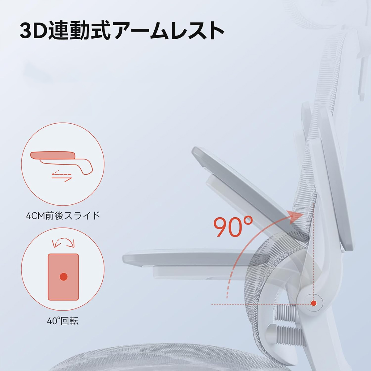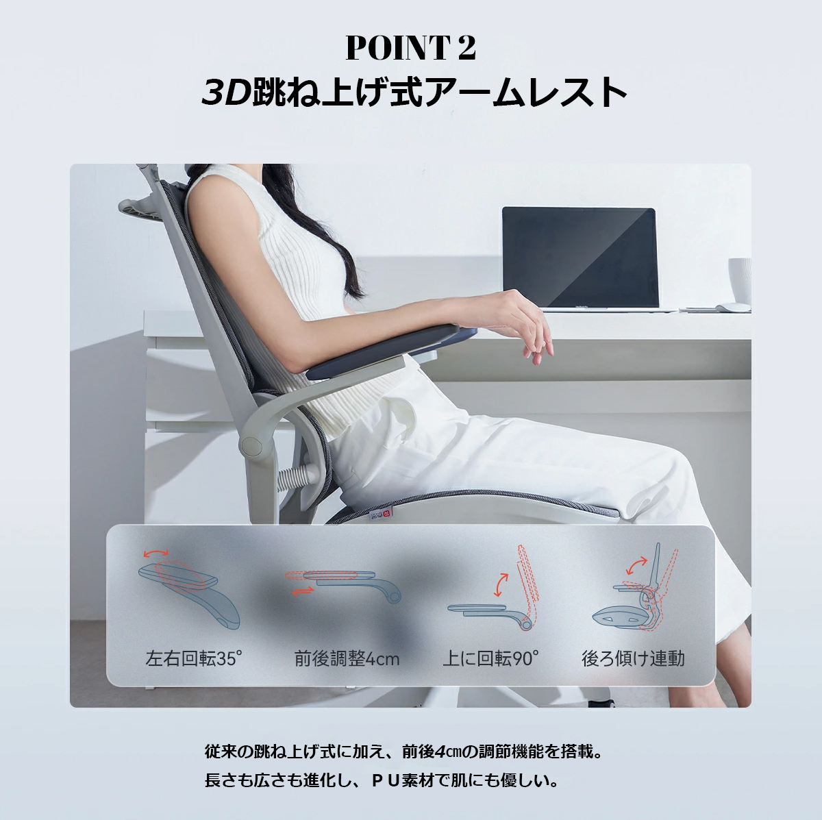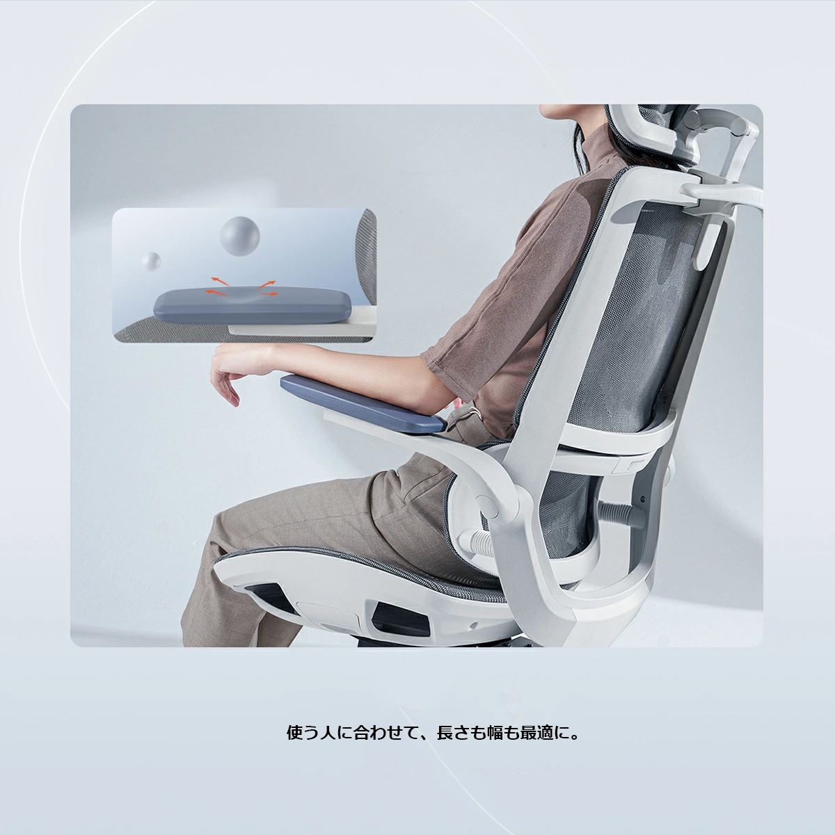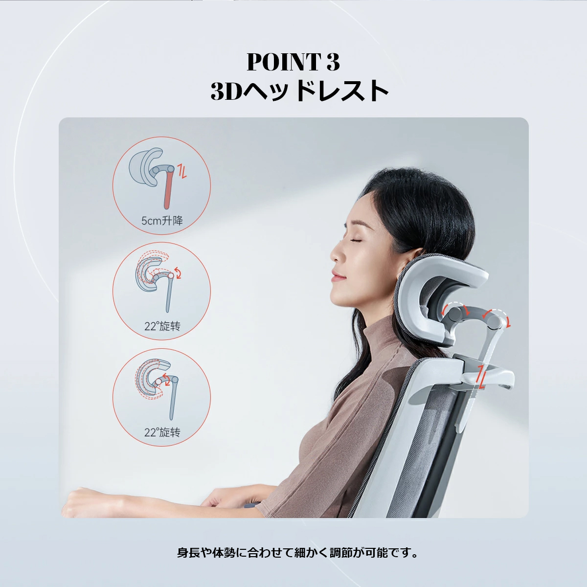 快適な作業をサポート:肘置きは、前後スライド、左右回転式。ヘッドレストは、高さ、2カ所角度調節