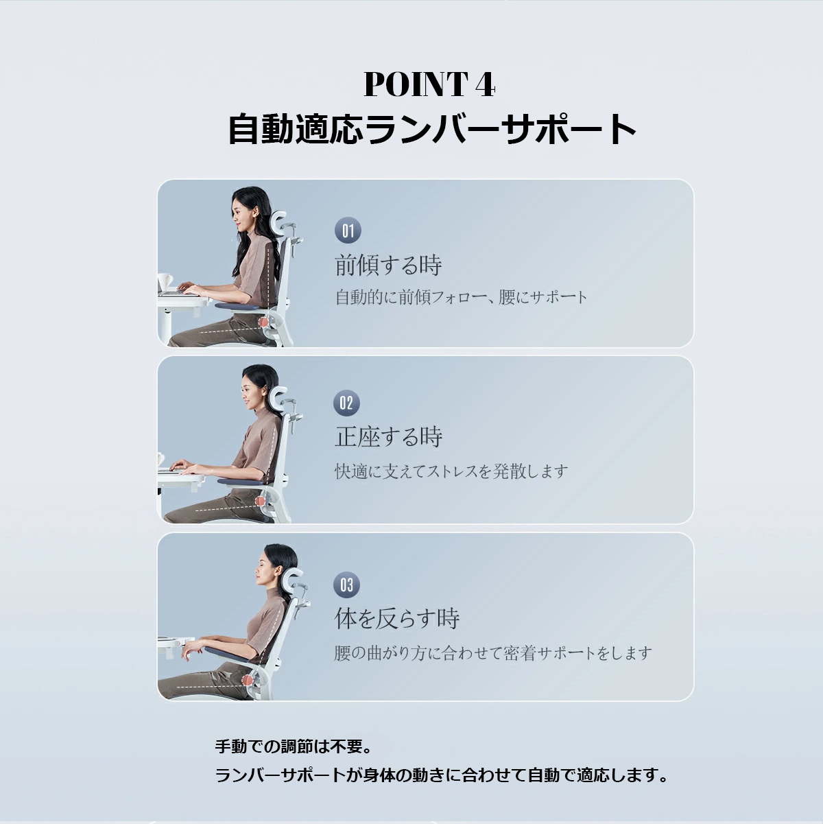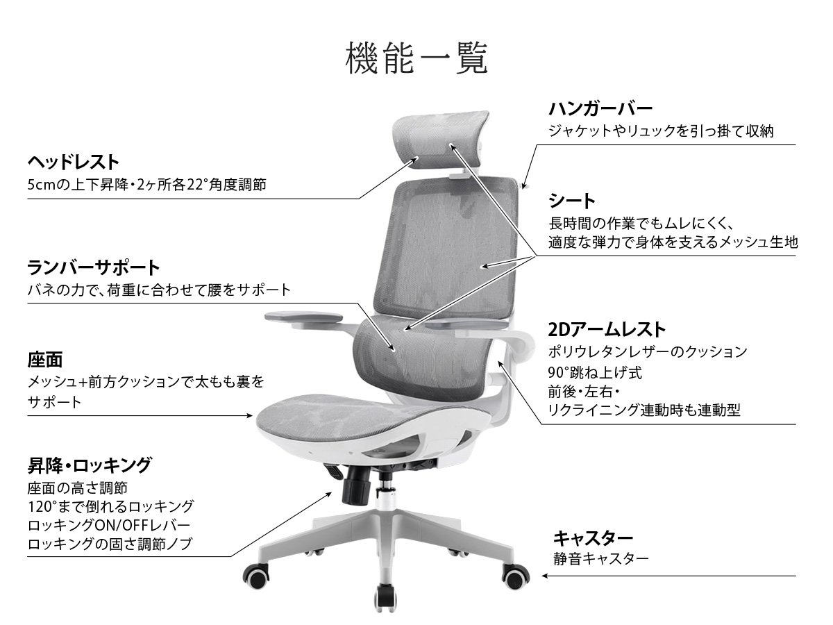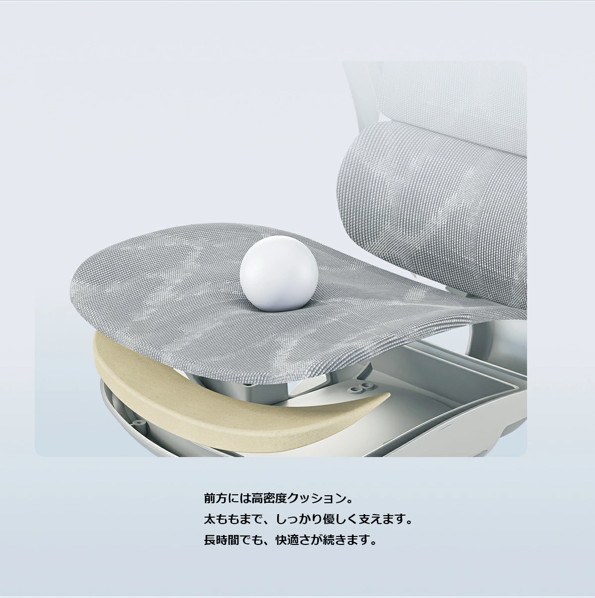 長時間使用できる:高い通気性と高弾力のメッシュシート。座面の前方に太もも裏をサポートするクッション付き。