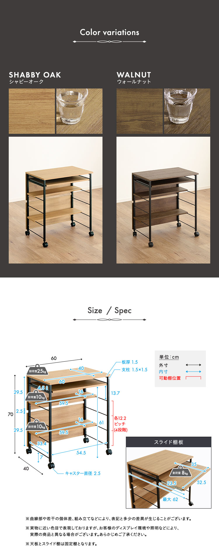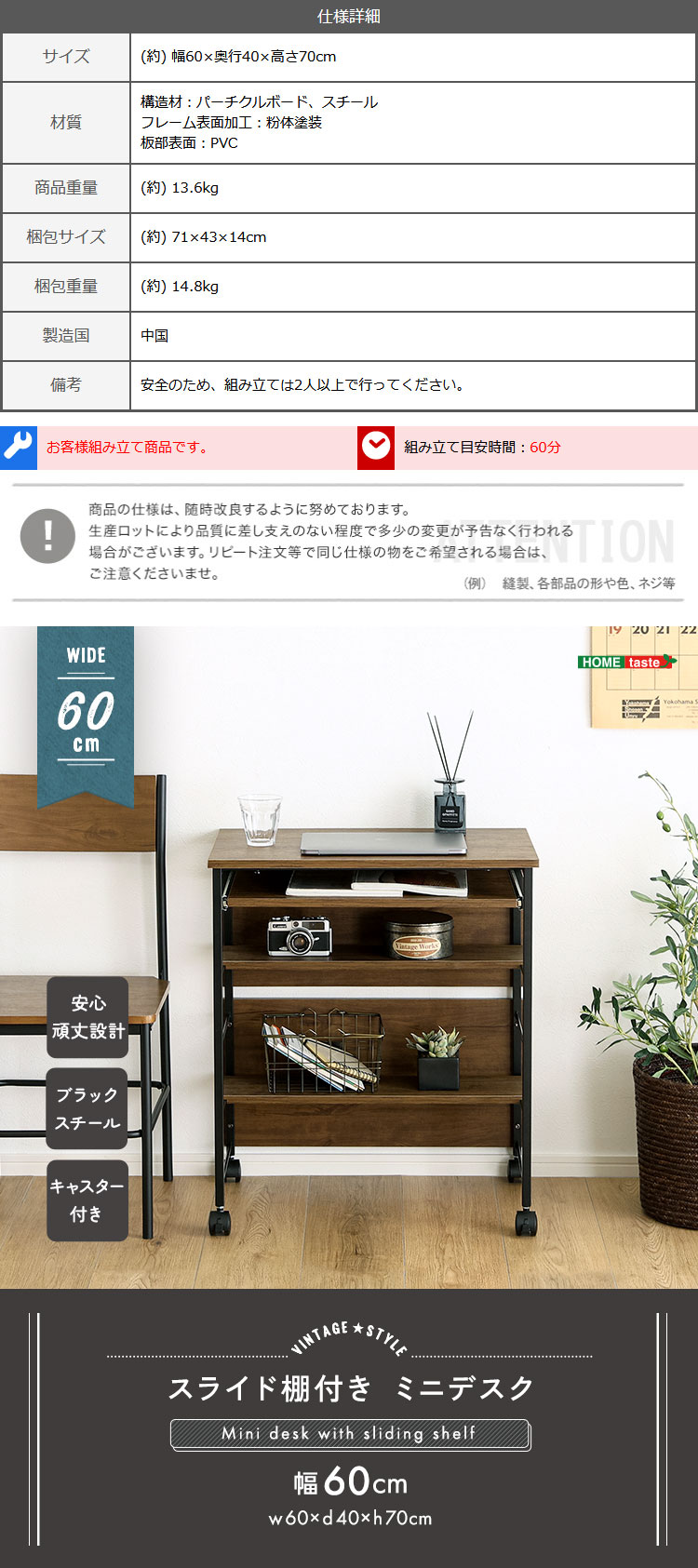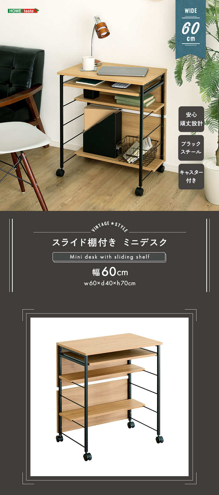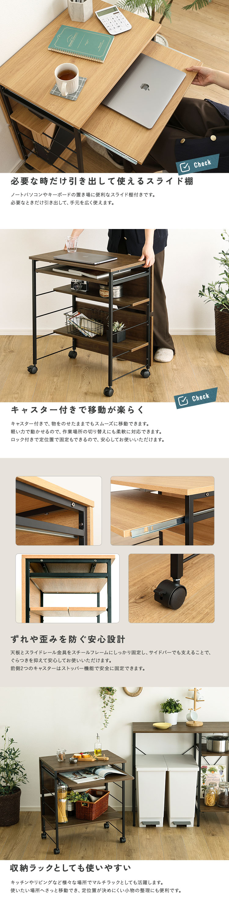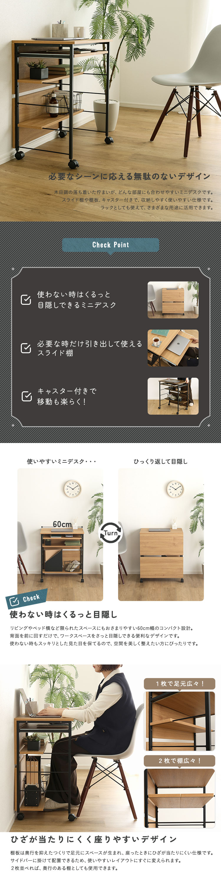スライド 棚付き ミニ デスク 幅60cm コンパクト すきま マルチ ワゴン キーボード 棚 収納 キャスター付 フレーム ワーク PC パソコン 学習 勉強 机 送料無料