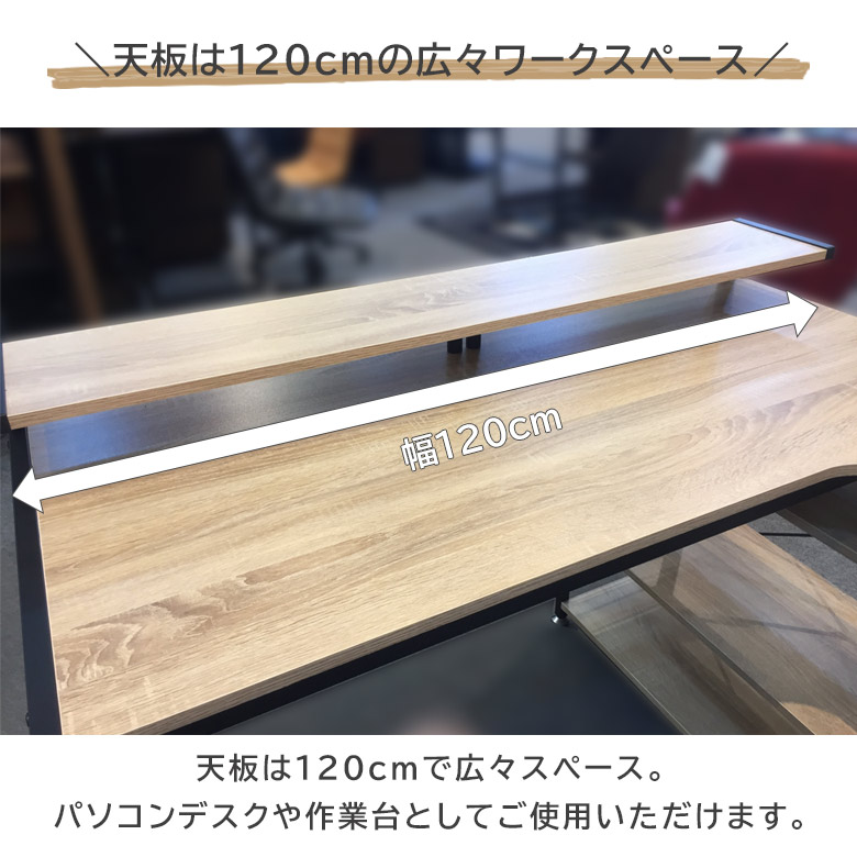 デスク天板は幅120cmで広々。作業台としてもご使用いただけます。