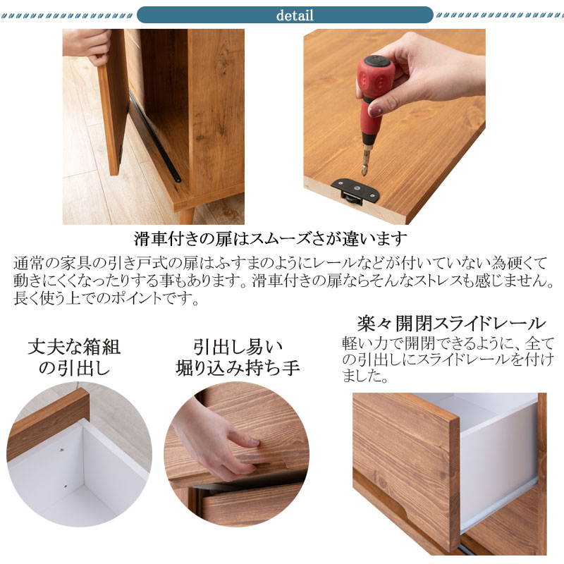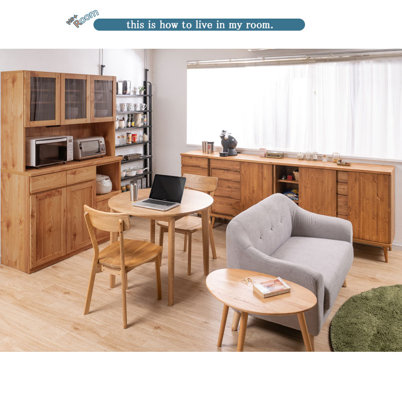 ■商品の仕様/天板:強化プリント紙化粧繊維板、前板:天然木パイン材(オイル塗装)、脚部:天然木ラバーウッド(ウレタン樹脂塗装)、その他:プリント紙化粧繊維板