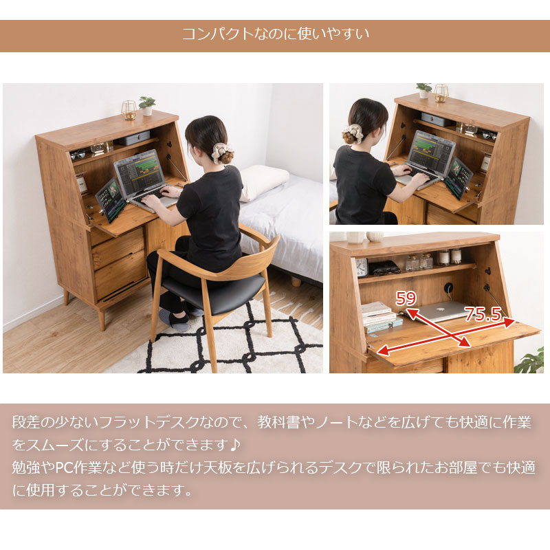 ■デスク部内寸/(約)幅75.5(ステイ金具まで71)×奥行23.5(使用時59)(棚板10後部1cm配線用隙間あり)×高さ34cm