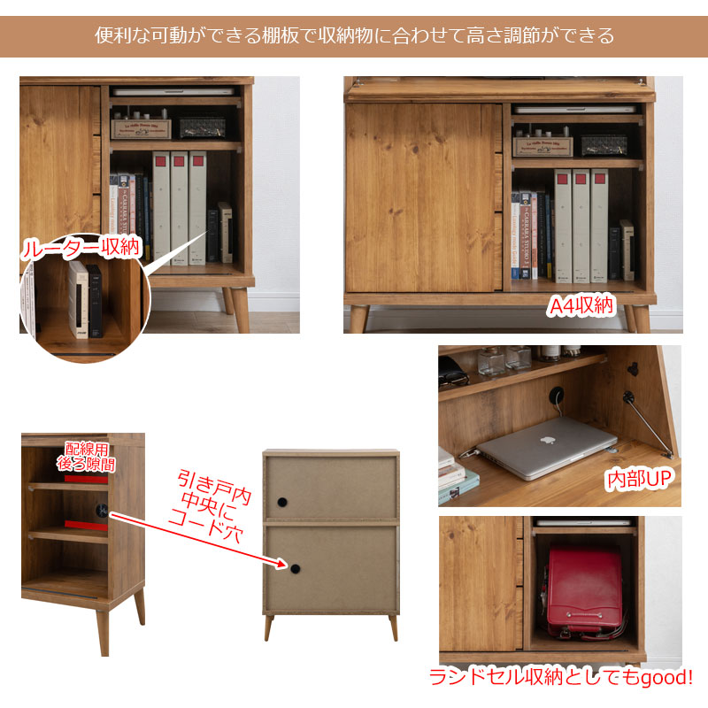 ■棚板/可動式:(デスク部)1枚(3cmピッチ・3段階)、(下引戸扉)2枚(3cmピッチ・13段階)