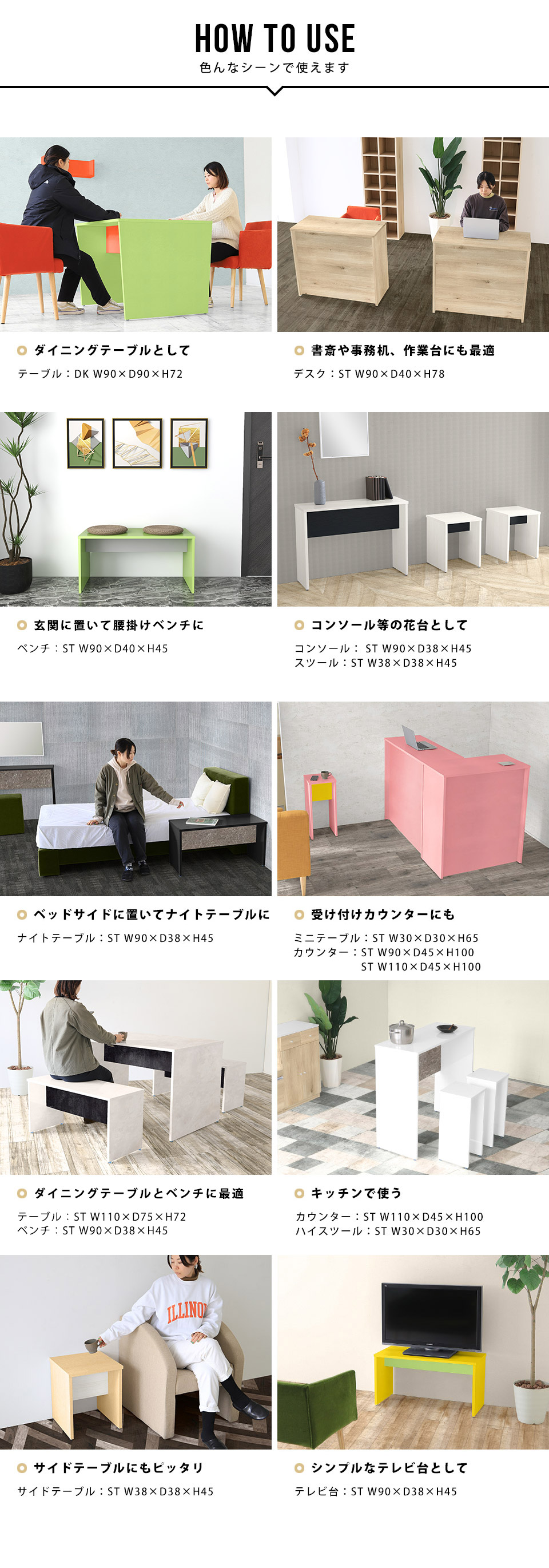 サイズ:約幅300〜1500 奥行き150〜900 高さ450〜1000 mm