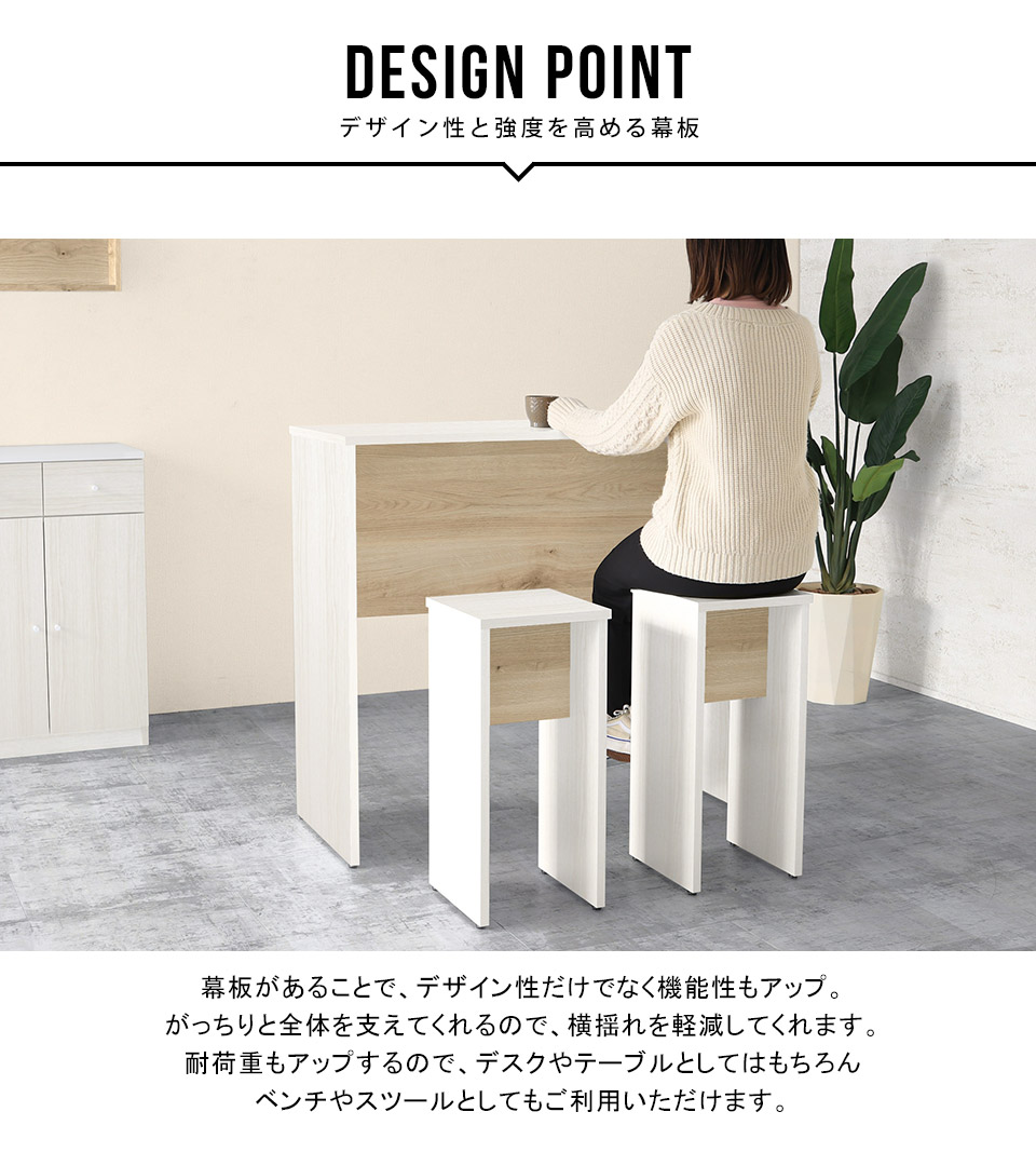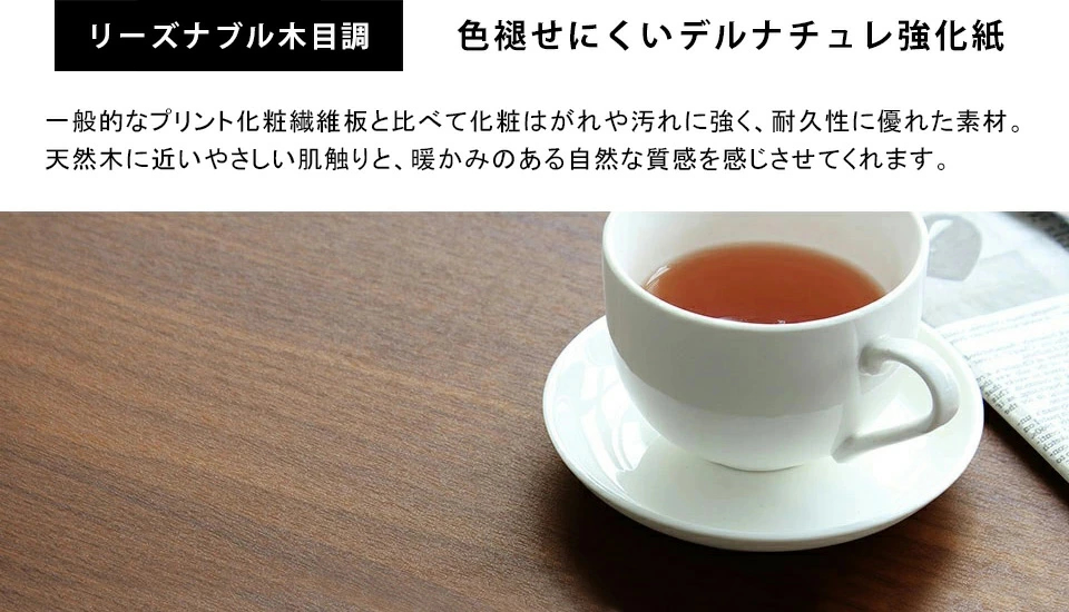 材質:リーズナブル木目:[天板]デルナチュレ化粧合板(ブラウン・ダークブラウン・北欧チーク)、強化紙化粧合板(ナチュラル・ホワイトウッド・オーク・ブラックウッド)、ポリエステル化粧合板(ホワイト)/[裏側・脚]プリント化粧合板