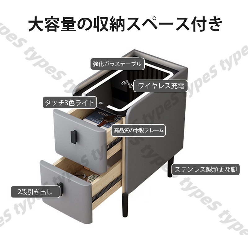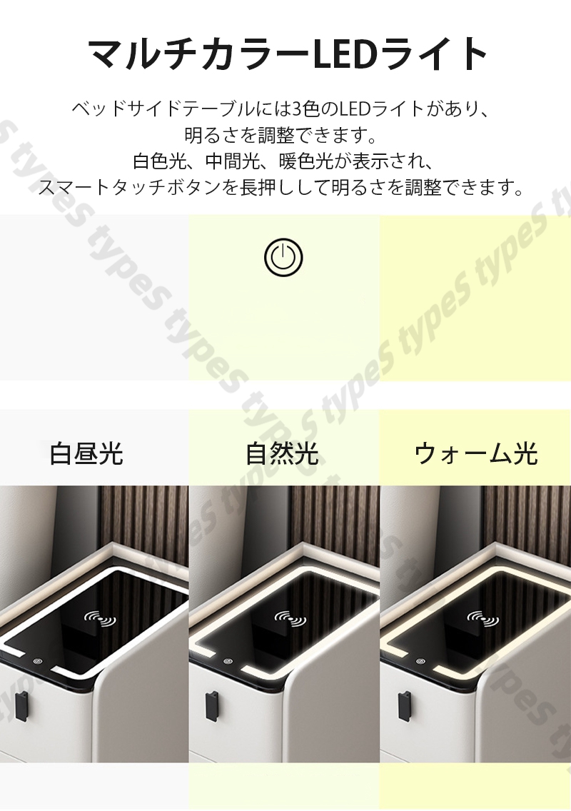 ベッドサイドテーブル スマートベッドサイドテーブル 3色照明ナイトライト付き ベッドサイドキャビネット ソファテーブル 小型