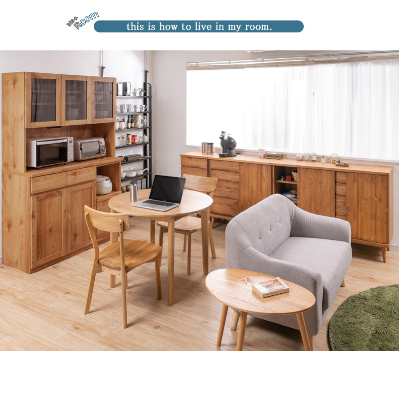 ■商品の仕様/天板:強化プリント紙化粧繊維板、前板:天然木パイン材(オイル塗装)、脚部:天然木ラバーウッド(ウレタン樹脂塗装)、その他:プリント紙化粧繊維板