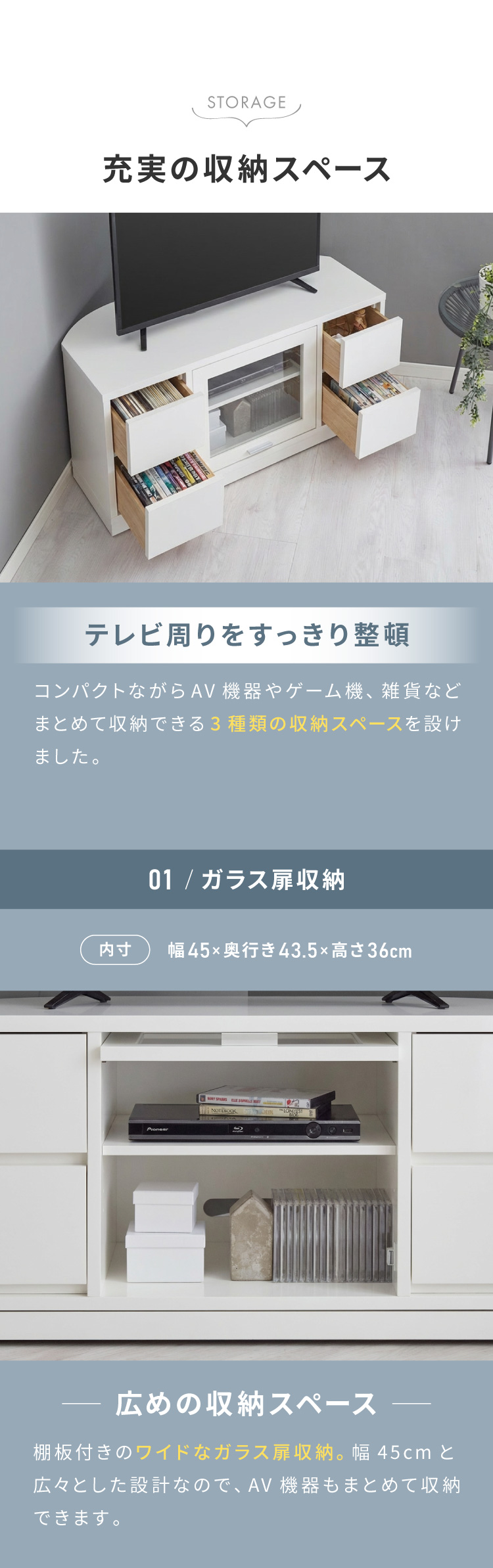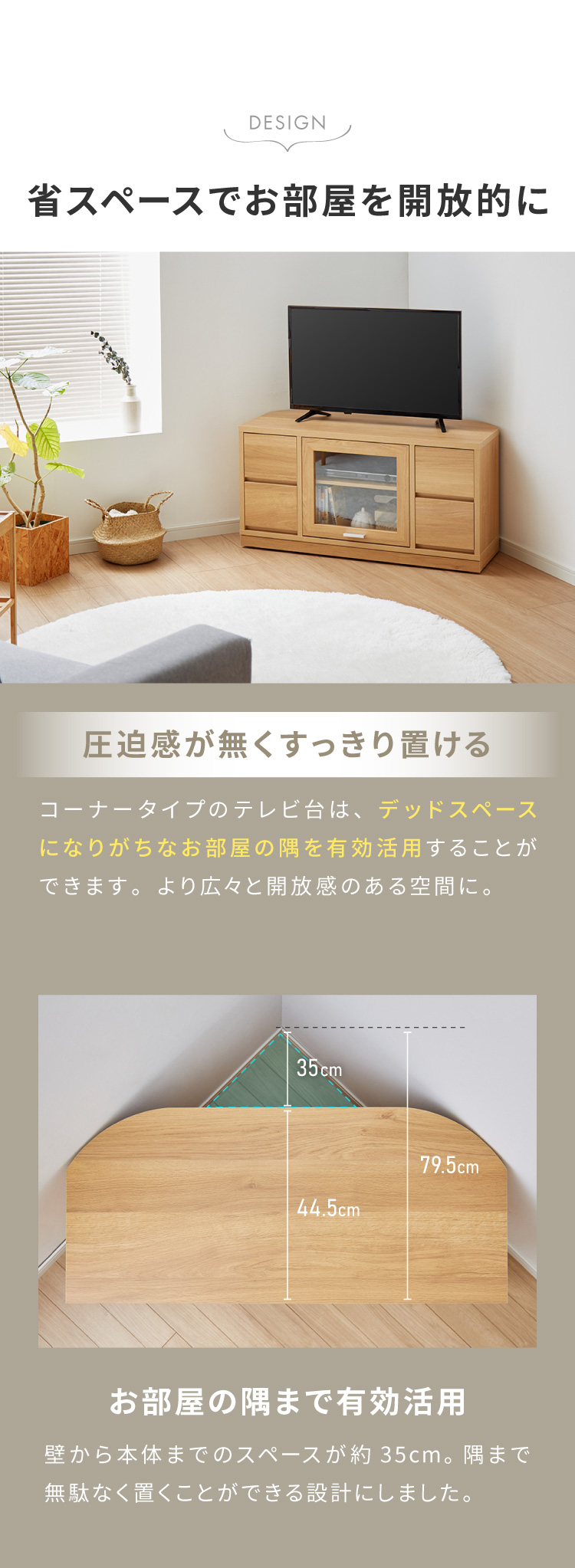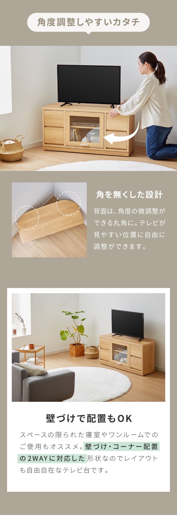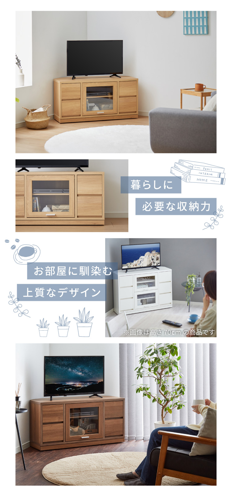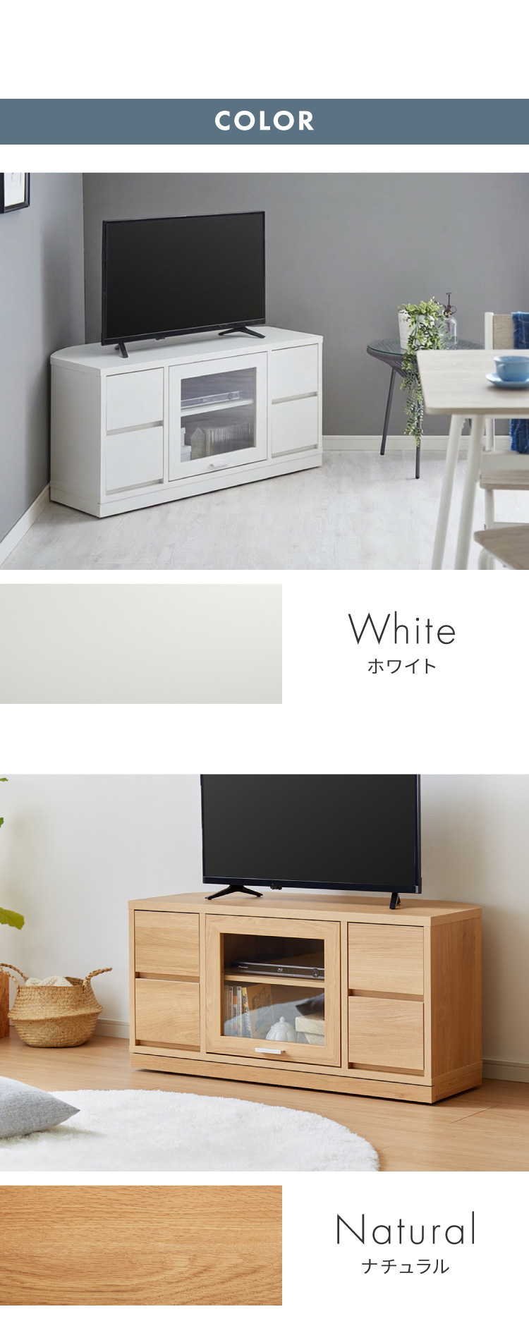 暮らしに必要な収納力と、空間になじむ上質なデザインを両立した、日本製のコーナーテレビ台です。