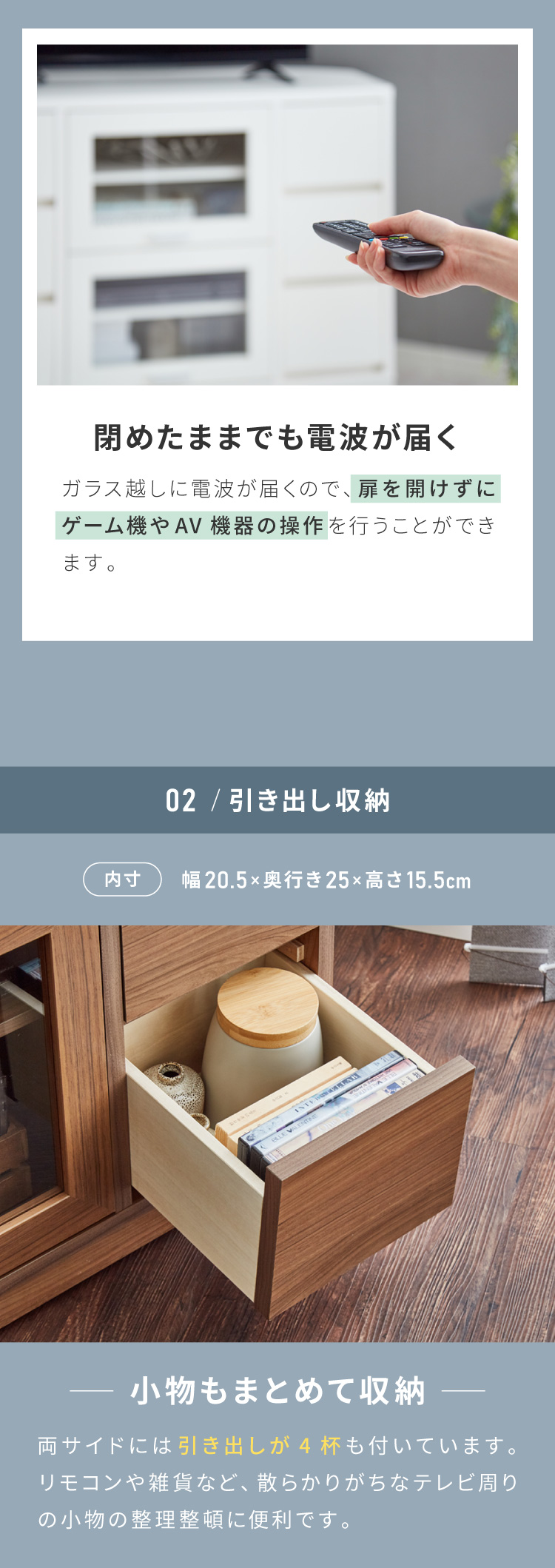 幅100cm・高さ50cmのコンパクトサイズながら、引き出し4杯+可動棚収納を備え、リビング周りの小物からゲーム機、DVD、配線機器までスッキリと整理できます。