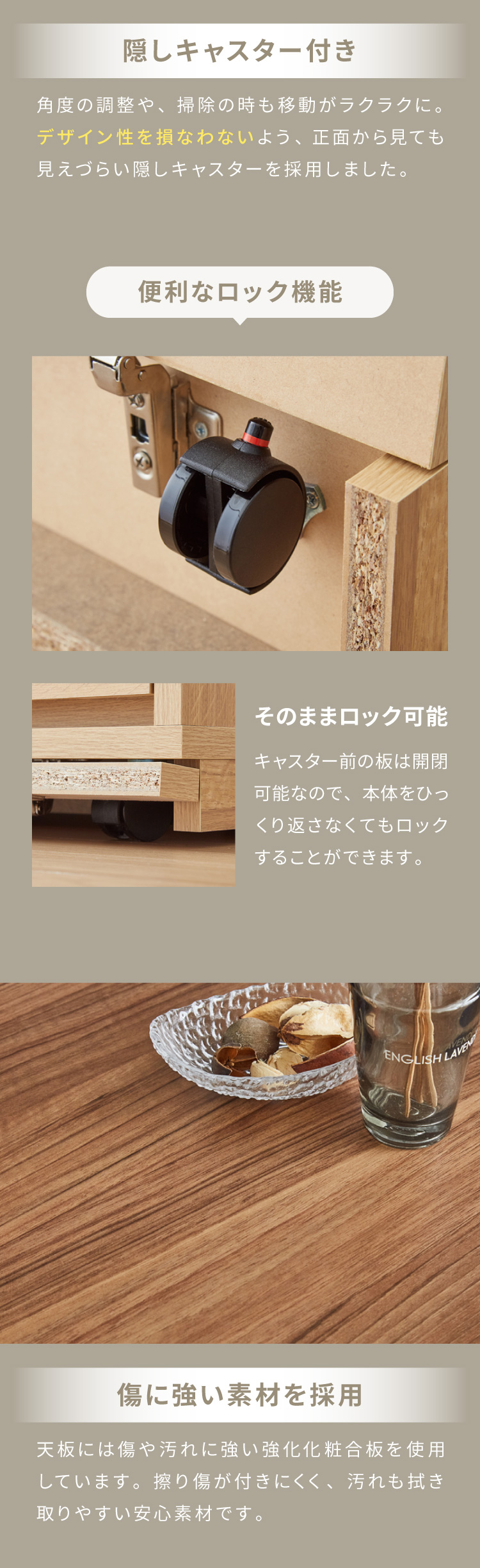 本製品は日本製・完成品でお届けするため、組み立ての負担がなく、開梱してキャスターや取っ手を付けるだけですぐにご使用いただけます。