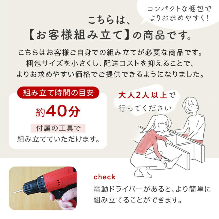 ※手回しドライバーでも組み立ては可能ですが、ネジの本数が多いため、電動ドライバーをご使用いただくと、よりスムーズに作業していただけます。