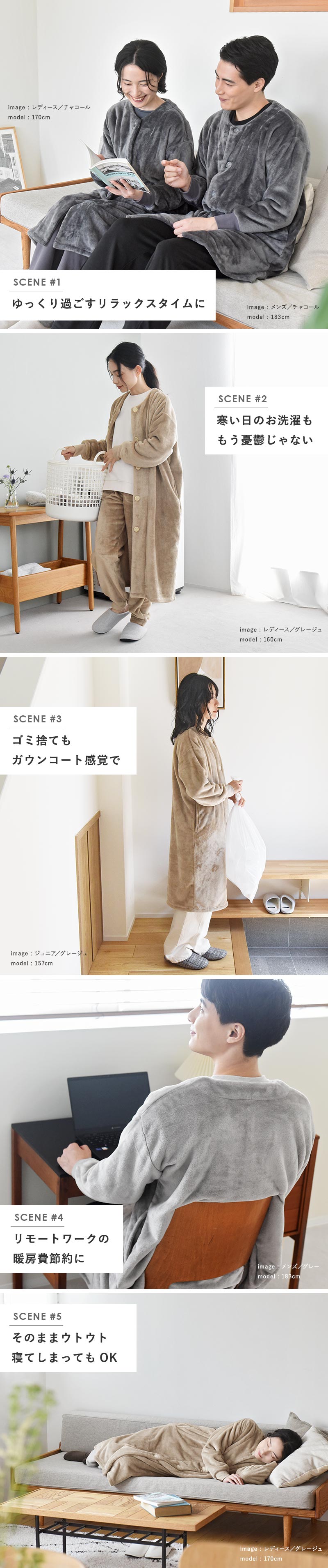 1枚着るだけで、毛布に包まれるあたたかさをずっと感じられるガウンは、冬の寒さ対策だけでなく、暖房費の節約などエコにも◎。
