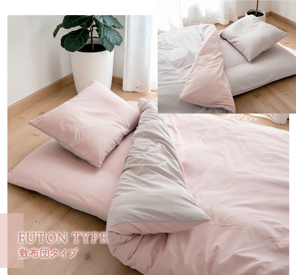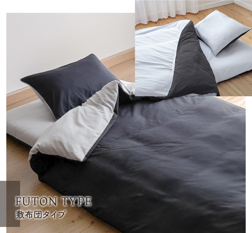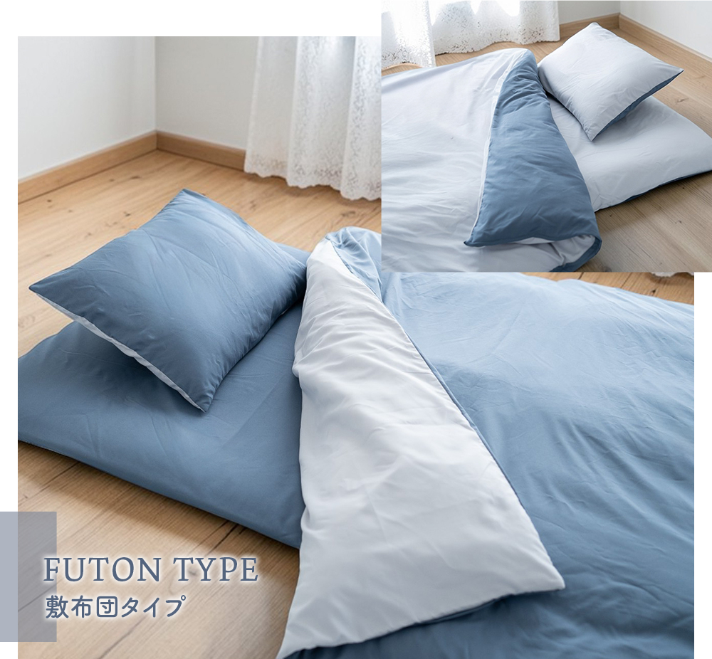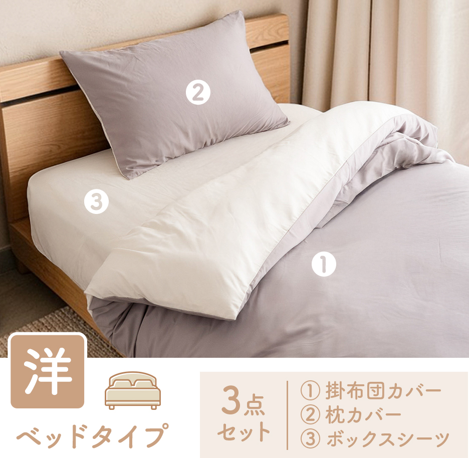 ・掛けカバー、ボックスシーツまたは敷布団カバー、枕カバーの3点セットです。