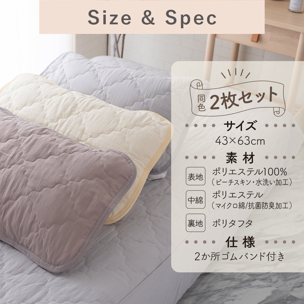 枕パッド 43×63cm 2枚セット 水洗い 抗菌 防臭 ピーチスキン ゴム付き ピローケース ピロケース ワンタッチ装着 洗える 柔らかい かわいい おしゃれ ふわふわ