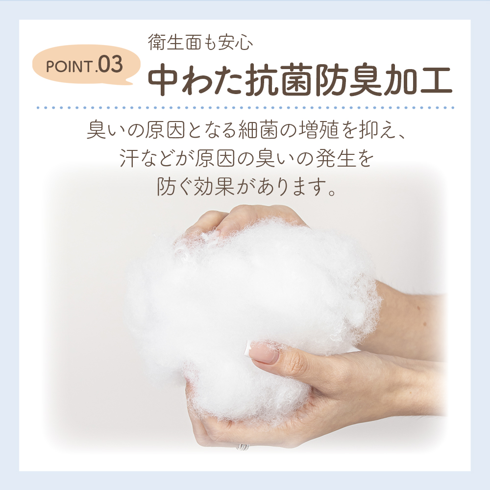 ・中材は、乾き安くて衛生的なポリエステルに抗菌防臭加工を施しています。抗菌防臭加工とは、臭いの原因となる細菌の繁殖を抑える加工で、汗などが原因の臭いの発生を抑制する効果があります。