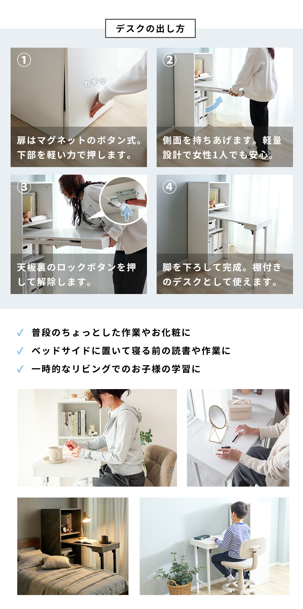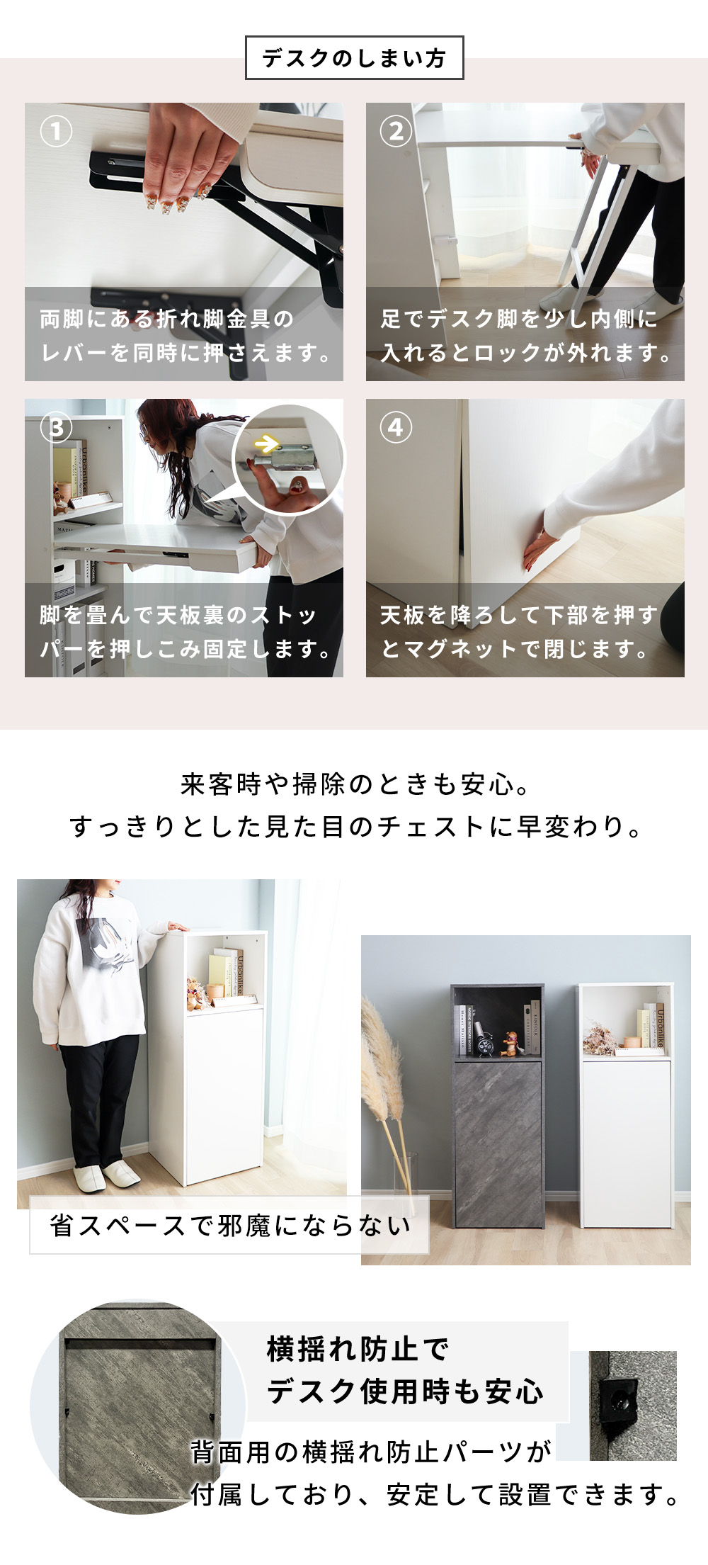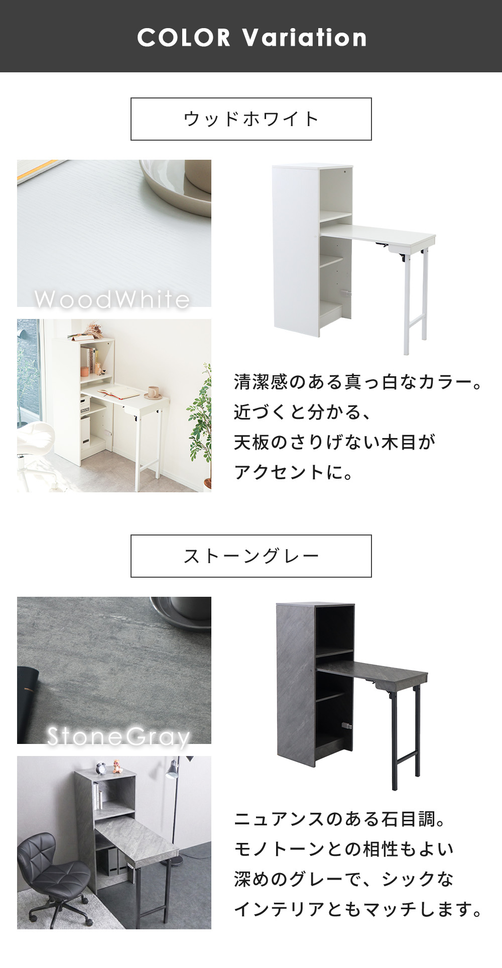 デスク おしゃれ 棚 付き 天板 収納 折り畳み 幅 38cm 102cm 収納型デスク 省スペース 机 収納 ホワイト グレー Storio ストリオ ヤマソロ