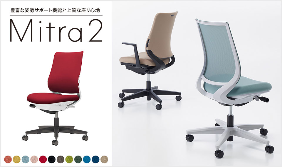 様々なシーンに美しく馴染むデザインに、快適な座り心地を実現する充実の機能を搭載した「Mitra2」です。コクヨが必要と考える姿勢サポート機能を全て盛り込み、働き方や作業姿勢の変化を踏まえた機能へと進化しました。一目でミトラとわかる基本デザインは守りながら、細部のクオリティを向上させ、スッキリと上質なデザインにまとめています。張地カラーも体系を見直し、人気カラーとトレンドカラーの両方からお選びいただけます。
