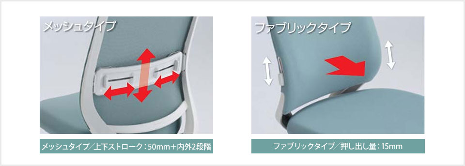 メッシュタイプはパッドの上下・内外調節が可能であり、身体の曲線に沿わせた適度なカーブ形状が接触面積を広げ体圧を分散させます。ファブリックタイプは、レバーを上下させることで、内蔵されたプレートの押し出し量を2段階に切り替えることができます。