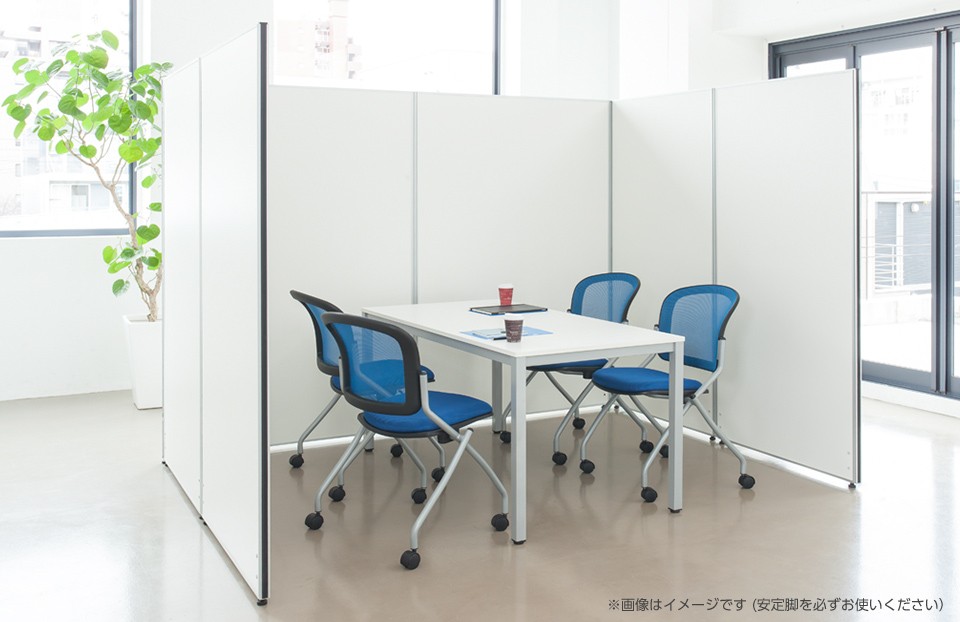 パネルを自立させる「安定脚」、連結しない側面に取り付けて安全性と美観性を高める「エンドカバー」、直角連結を可能にする「コーナーポール」の3つのオプションと連結パターンを組み合わせ、間仕切りから独立空間まで幅広く対応。連結方法次第で、多様なレイアウトが実現します。