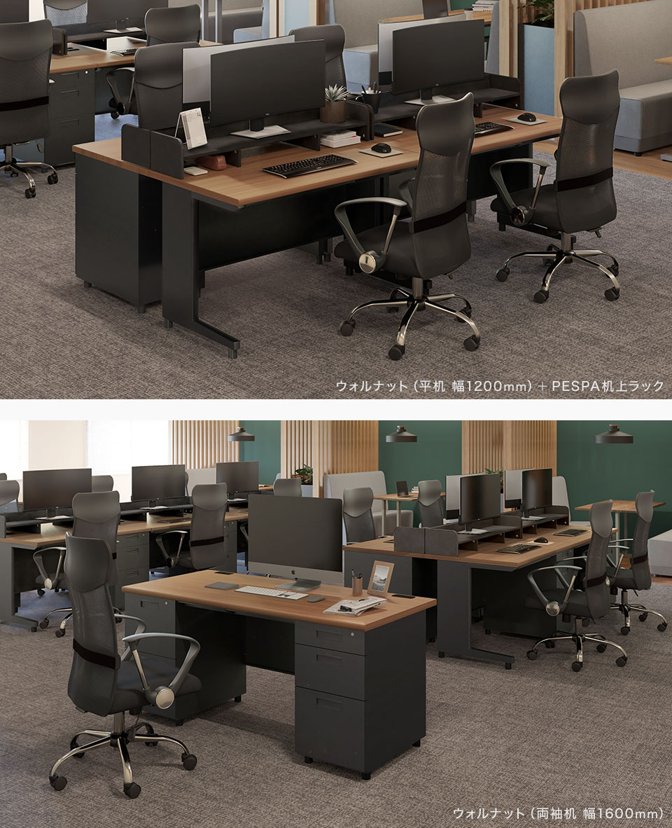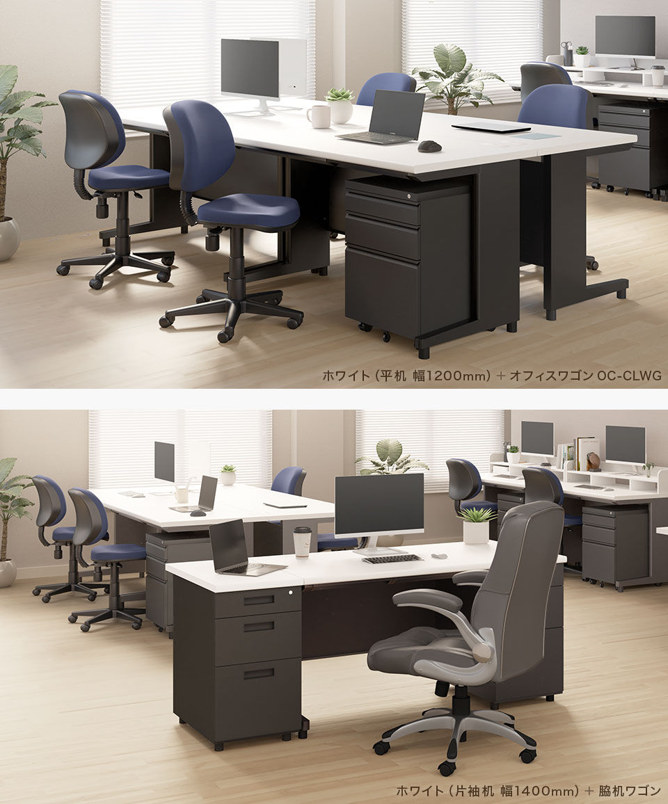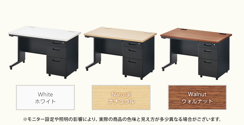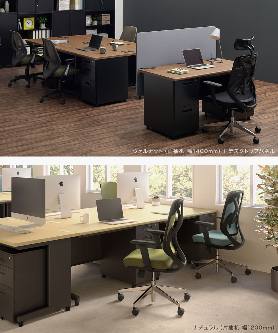 デスクは幅1000、1200、1400、1600mmの4サイズ、平机・片袖机・両袖机の3タイプをご用意。用途に合わせてお選びください。