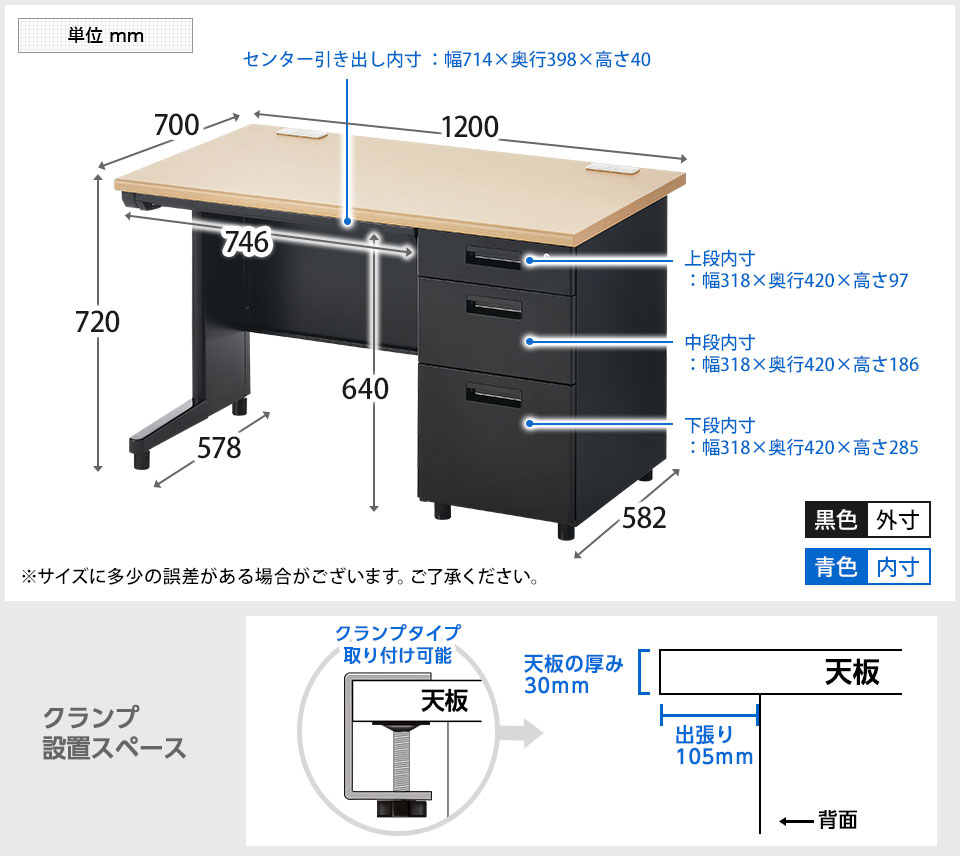 天板 / 100kg、袖箱3段 / 上段5kg、中段10kg、下段25kg