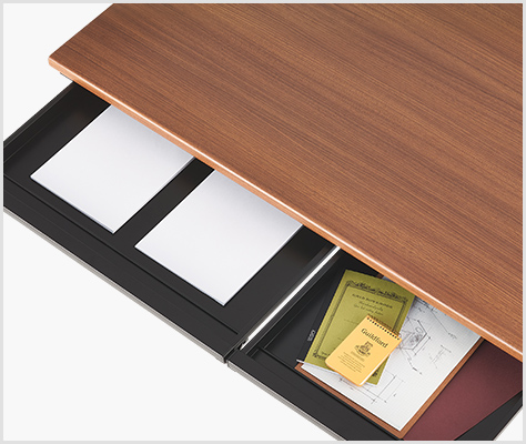 手元には、サッと文具や書類などを収納できる便利な薄型の引き出し付きです。A4・A3サイズのファイルを楽々収納できるサイズ感が、業務効率を上げます。