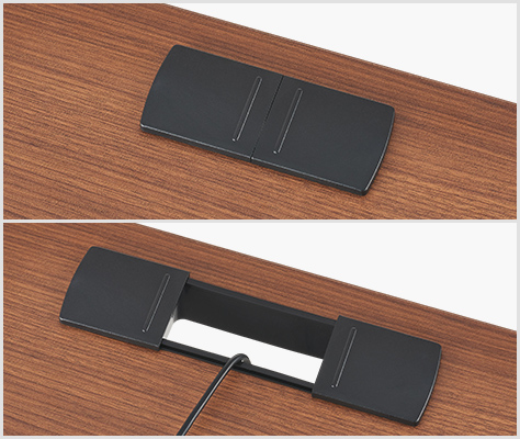 パソコンや電話などのコードを通せるフタ付きコードホールが付いています。使用する時は蓋をスライドして、スッキリとまとめて配線できます。