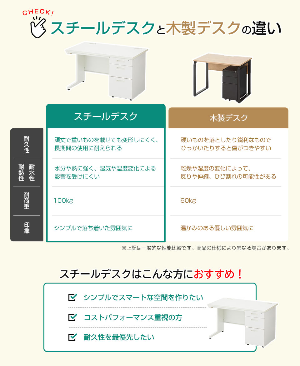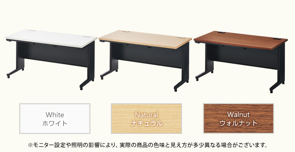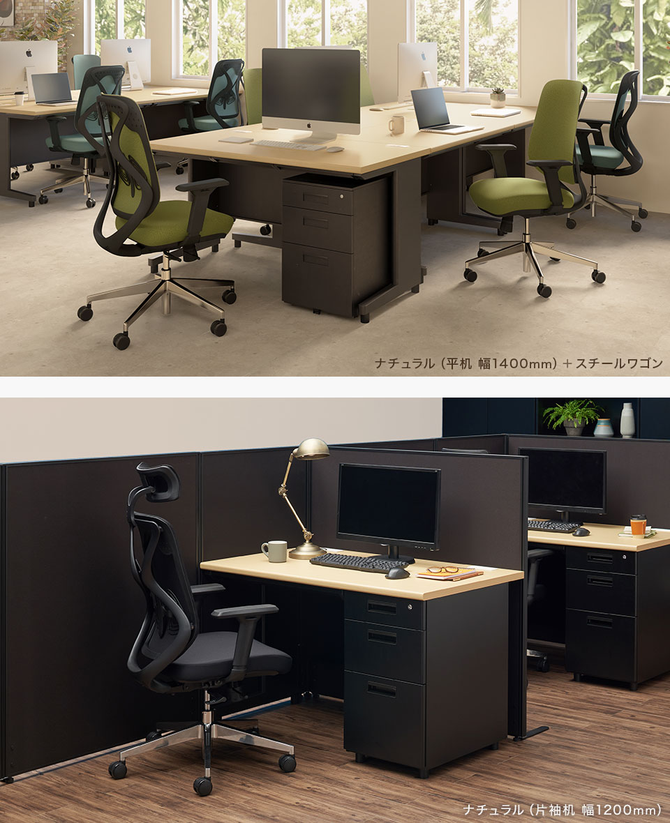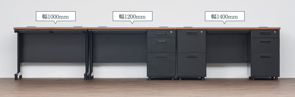 デスクは幅1000、1200、1400、1600mmの4サイズ、平机・片袖机・両袖机の3タイプをご用意。用途に合わせてお選びください。