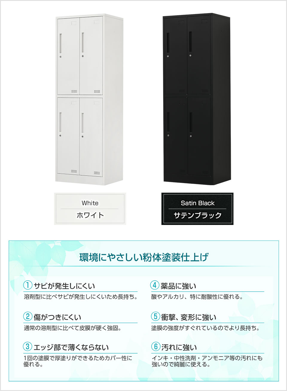 使いやすい、合わせやすい、お求めやすい。オフィスの基本のニーズに応えたシンプルなワイドロッカーです。頑丈なスチール製で、幅608×高さ1800mmの2列2段4人用タイプ。ホワイトとサテンブラックの2色展開で、幅広い空間になじむスタンダードなデザインに、シリンダー錠やハンガーパイプなどの機能を装備しました。複数を連結することでメンバーの増員にも対応。オフィスの更衣室や店舗のバックヤード、スポーツジムなど多様なシーンで活躍します。
