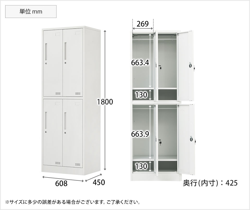 内寸(下段1人あたり) / 幅269×奥行425×高さ(663.9+130)mm