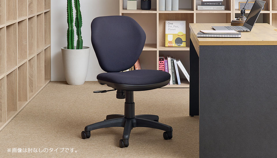 コンパクト&シンプルなので、さまざまな空間に合わせやすいデザインです。肘なしタイプは、デスク下へ収納しやすいためスッキリとした印象になります。
