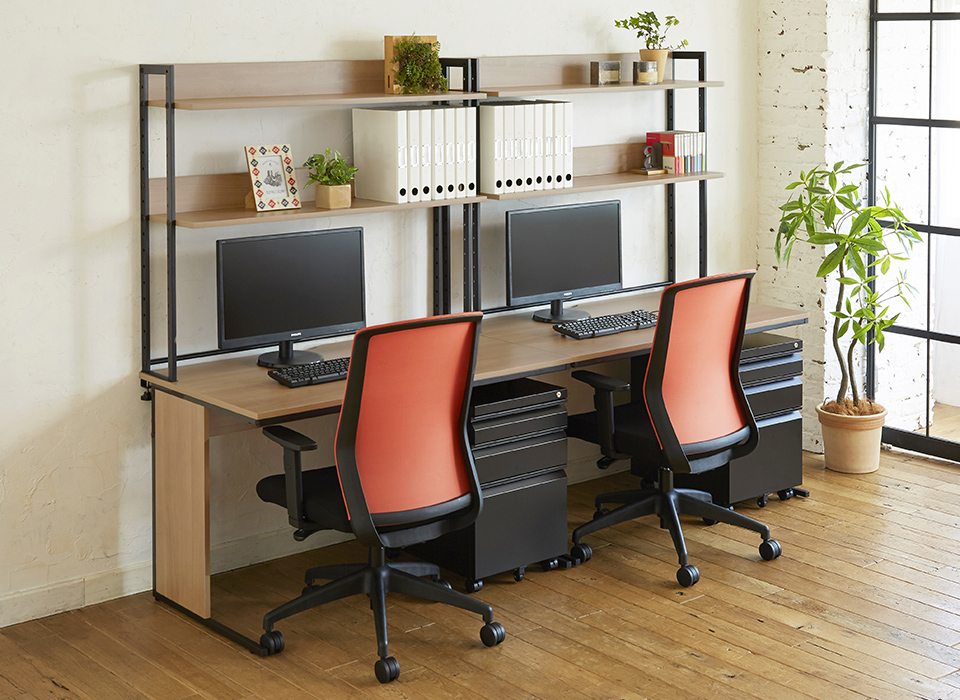 高さ調節ができる棚を2段搭載し、デスク上を大容量収納スペースとして活用できる机上ラック。目の前からサッと取り出せるのでデスクワークがはかどります。普段使いの小物から、ファイルや資料まで収納できるので、作業効率がぐっとアップ。スタンダードなカラーからインテリア性の高いバイカラーまで、様々なオフィスに使っていただける4色をご用意しました。