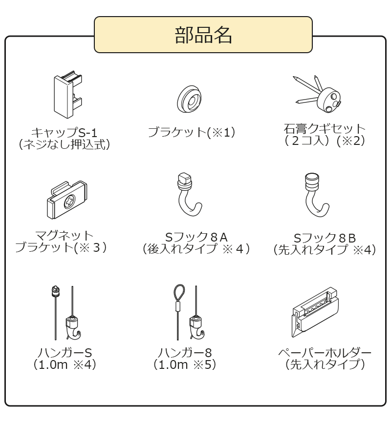 ※4 Sフック8AとハンガーSは組み合わせできません。ハンガーSは直接レールに取付けができます。