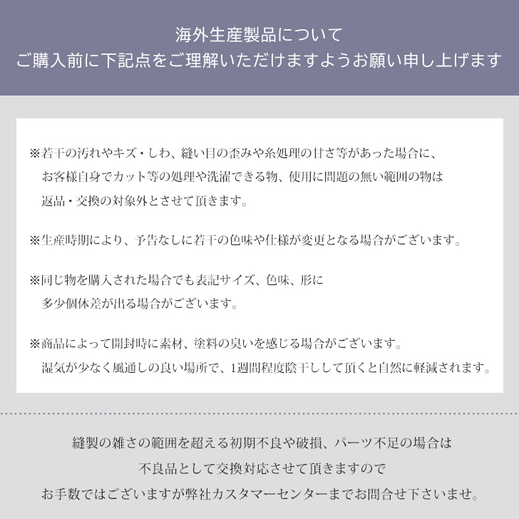 ■注意事項1:商品の開封時に素材の臭いを感じる場合がございます。湿気が少なく風通しの良い場所で、一週間程度陰干しして頂くと自然に軽減されます。