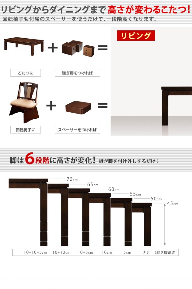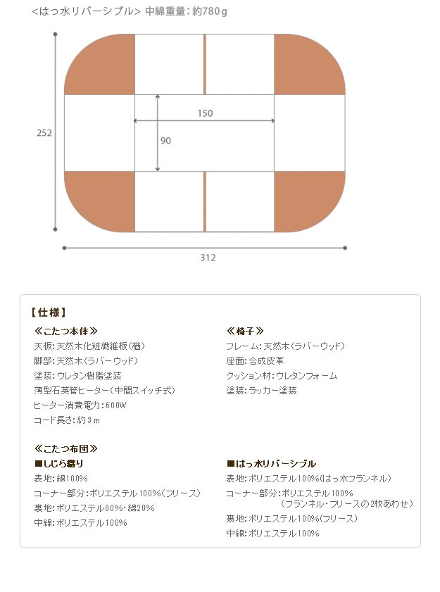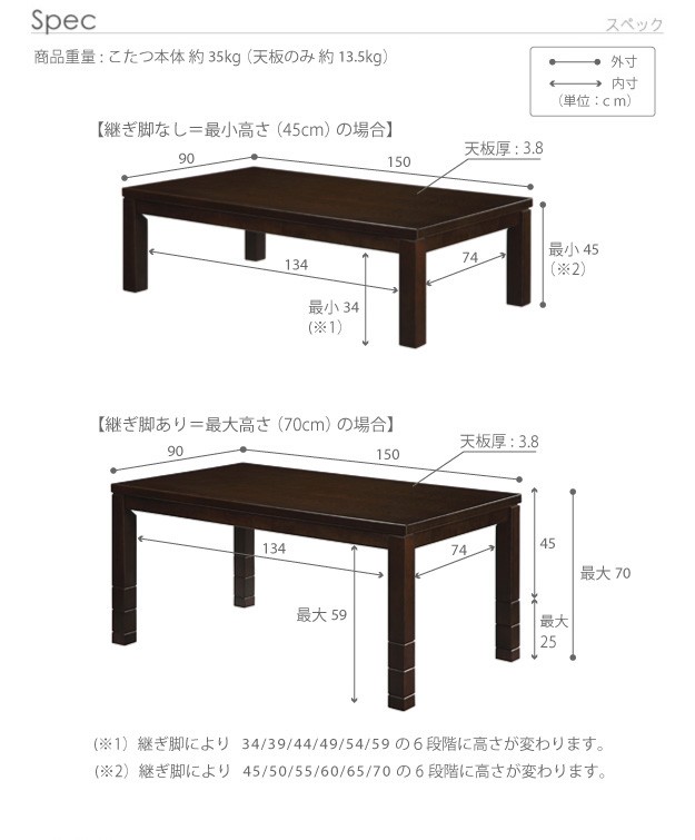 【こたつサイズ】幅:150cm×奥行:90cm×高さ:45〜70cm