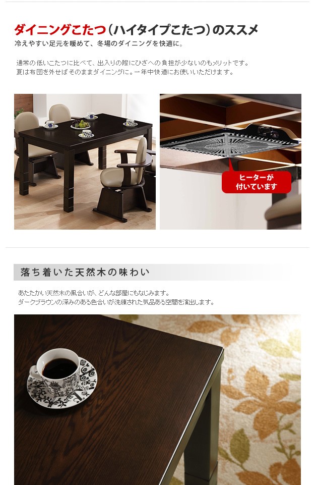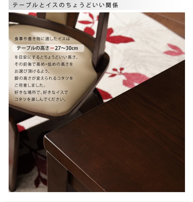 こたつ、布団、椅子が付いたこたつ3点セット「Skutt 150×90 ハイタイプこたつ布団セット」。届いたその日からすぐにお使いいただけるのでとても便利です!