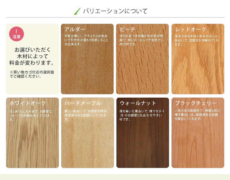 天板素材 アルダー材・ビーチ材・レッドオーク材・ホワイトオーク材・ハードメープル材・ウォールナット材・ブラックチェリー材 のいずれか