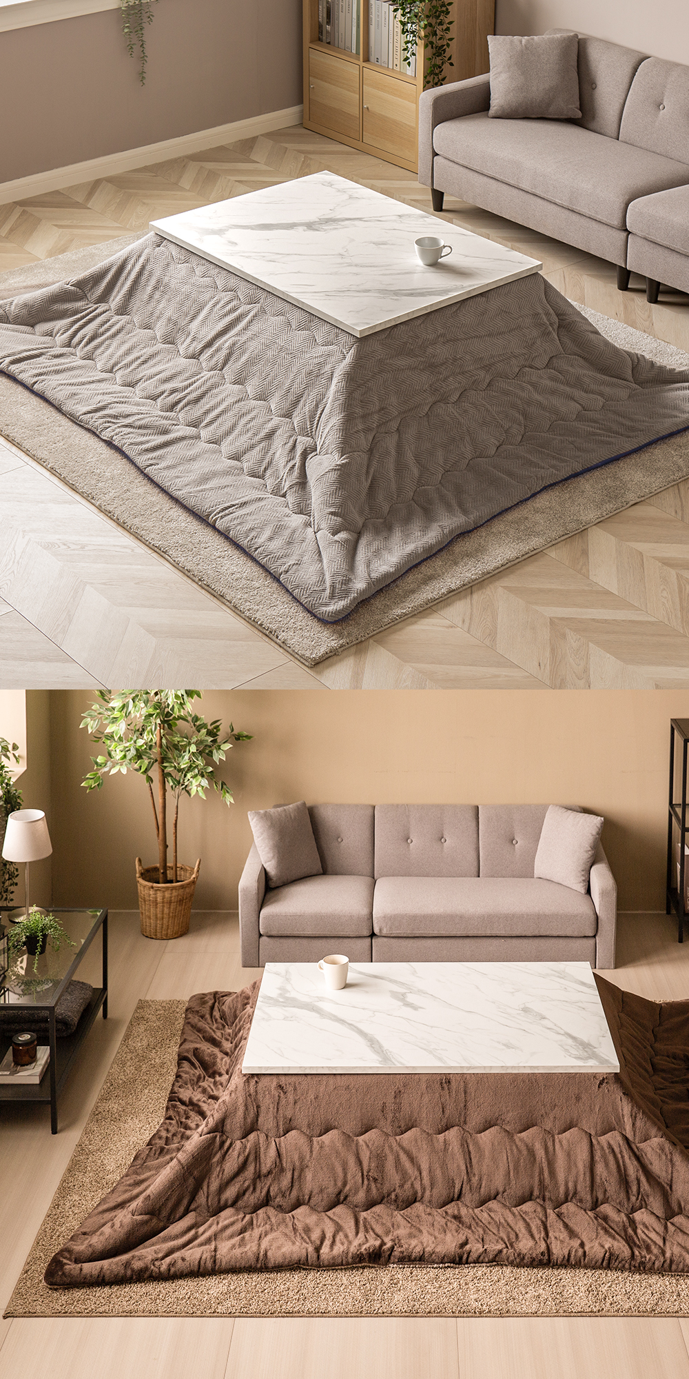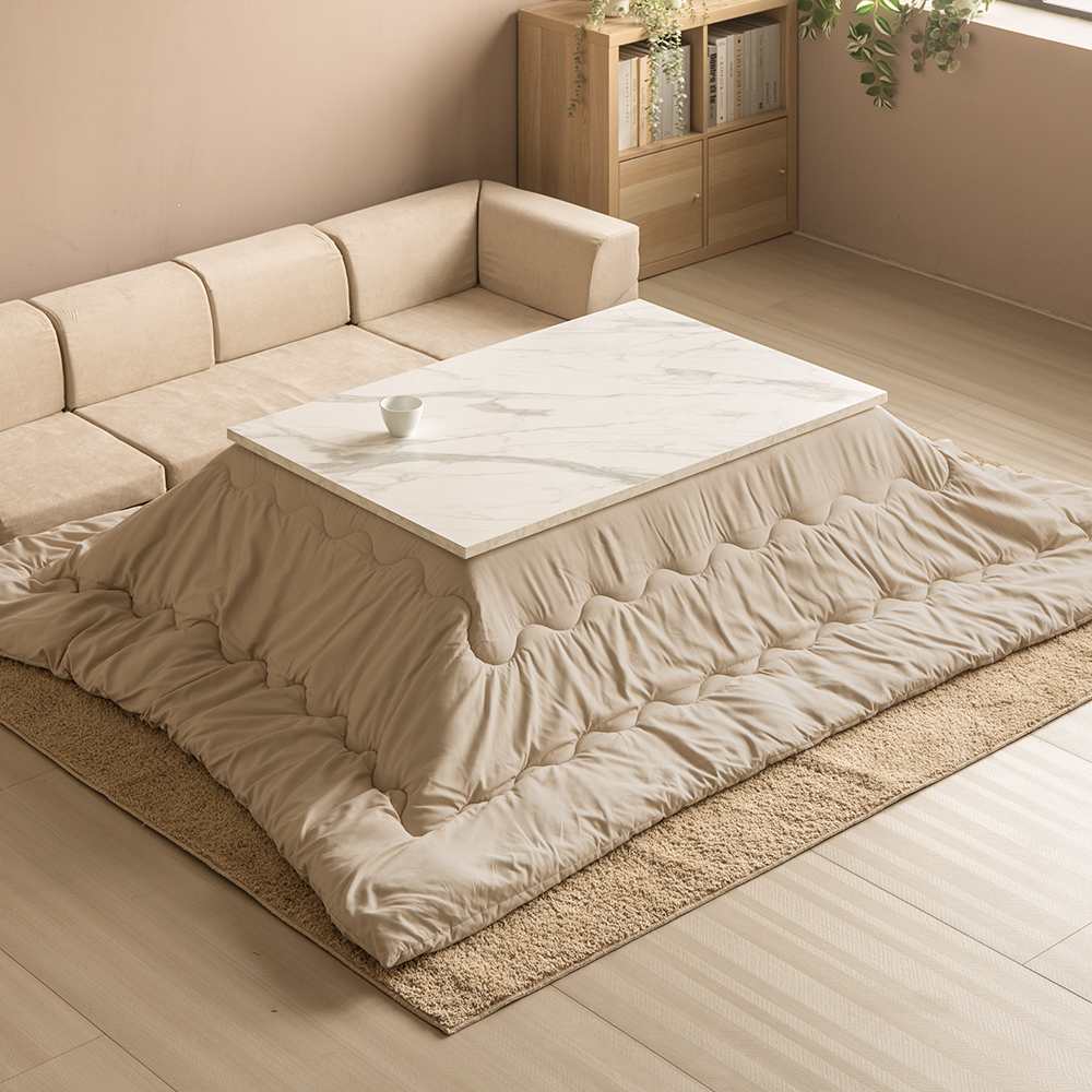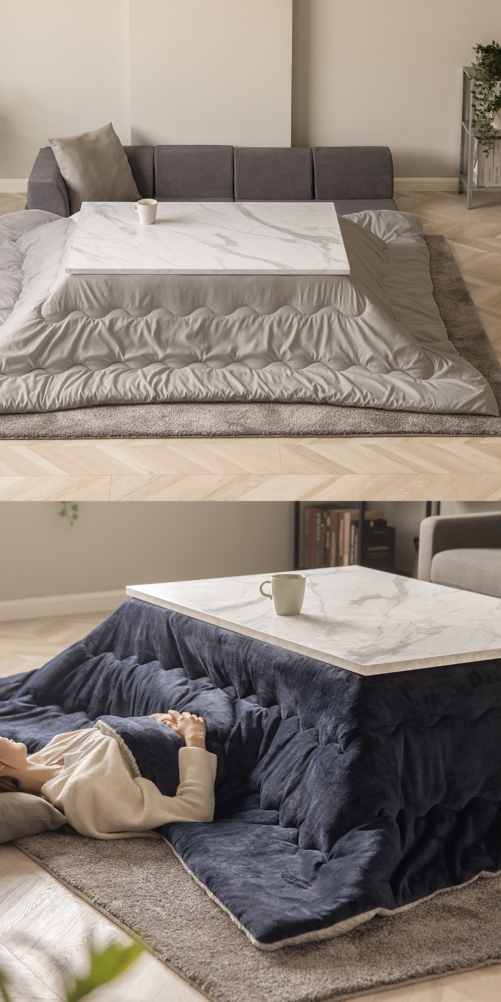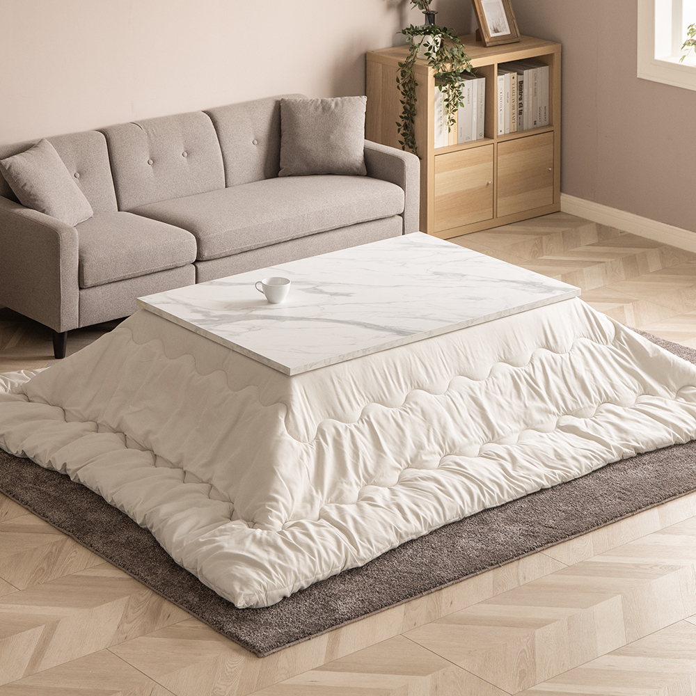 大理石柄のデザインと直線的でシンプルなフォルムが、上品でモダンな印象を与えるこたつです。