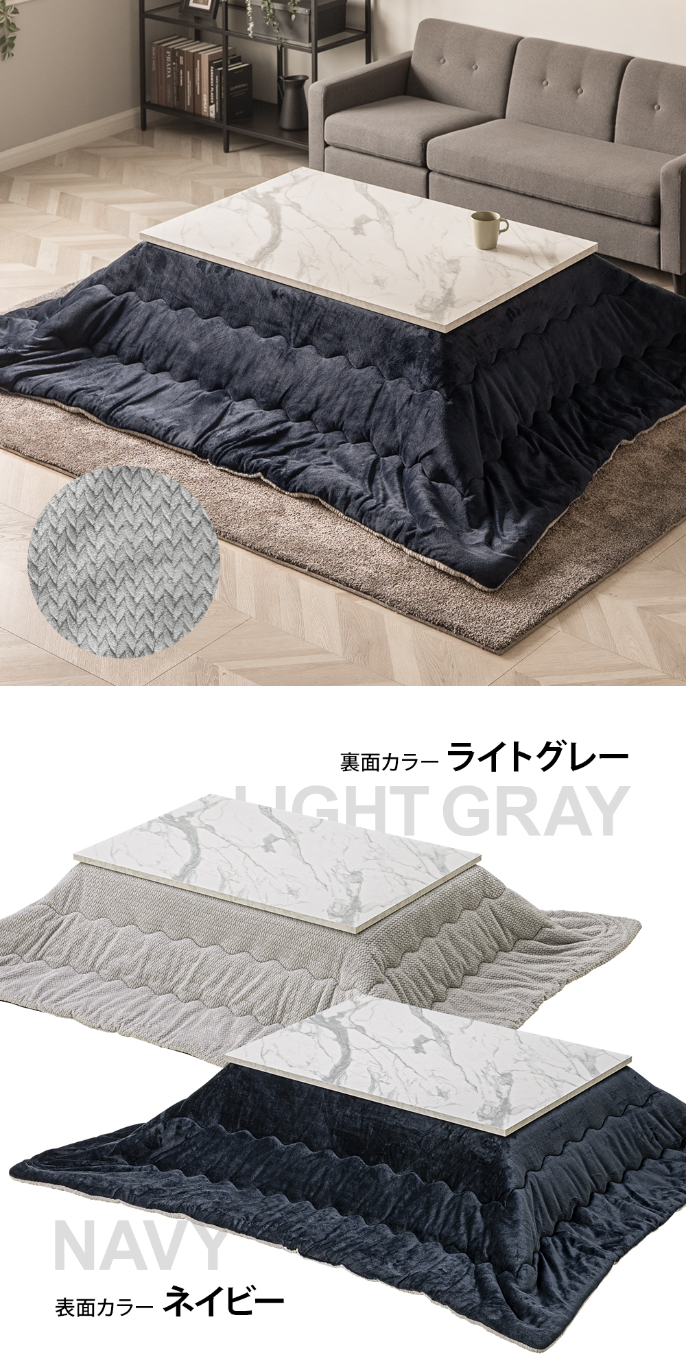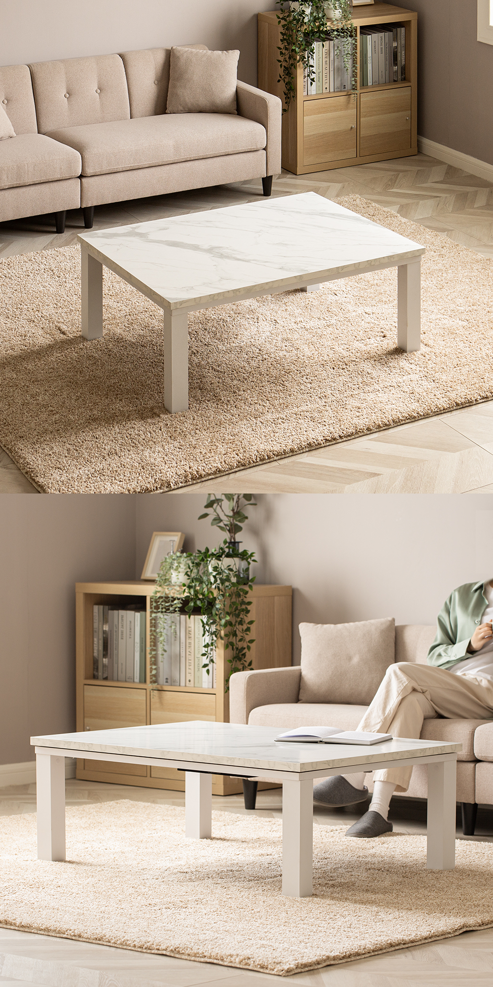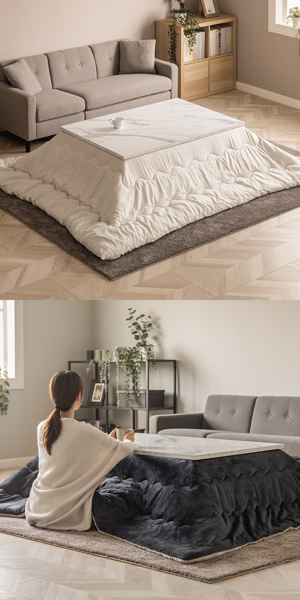 大理石柄のデザインと直線的でシンプルなフォルムが、上品でモダンな印象を与えるこたつです。