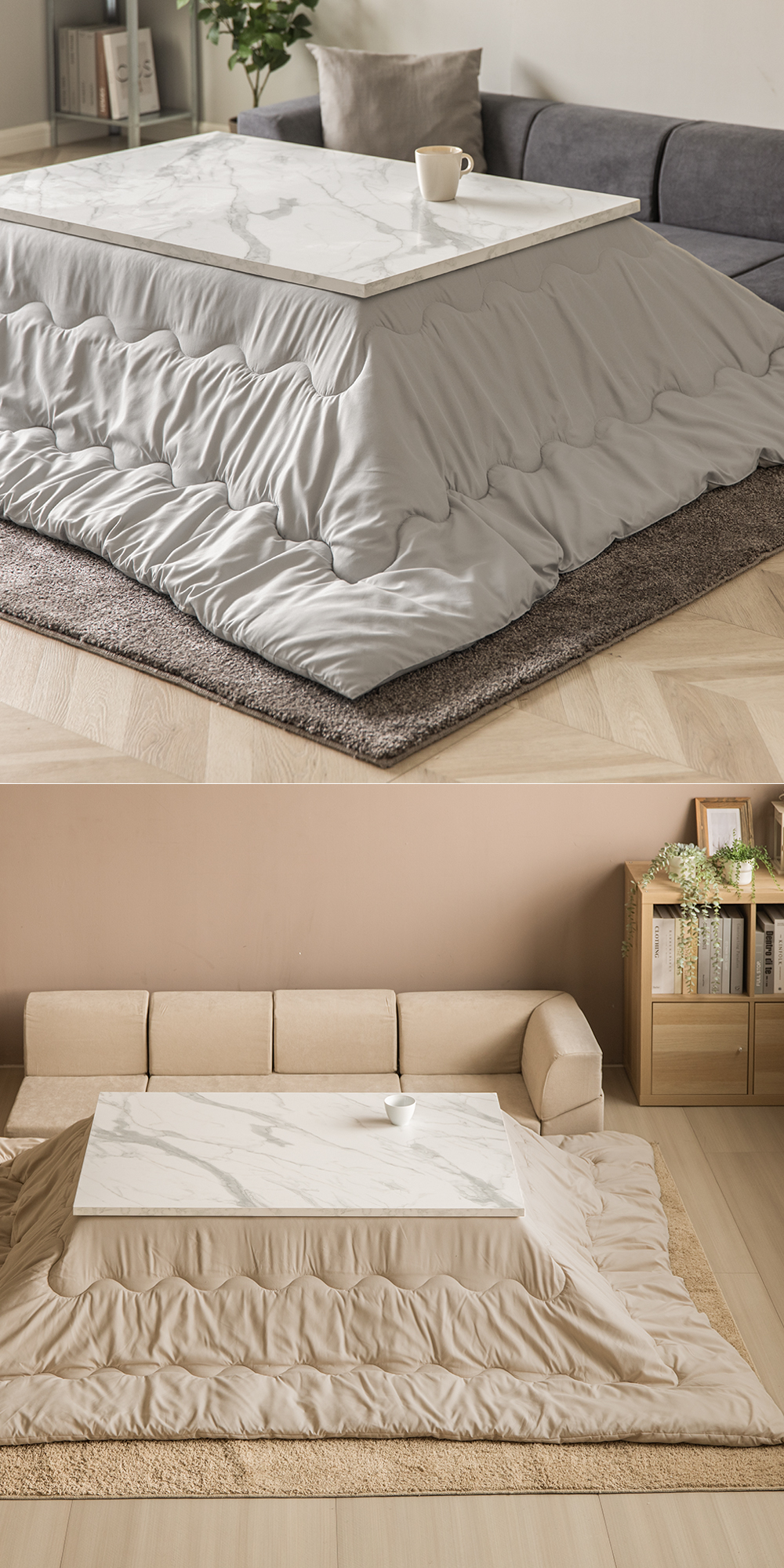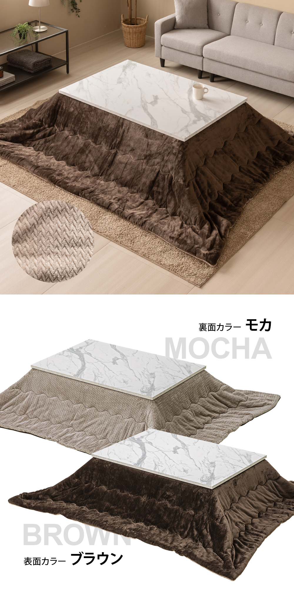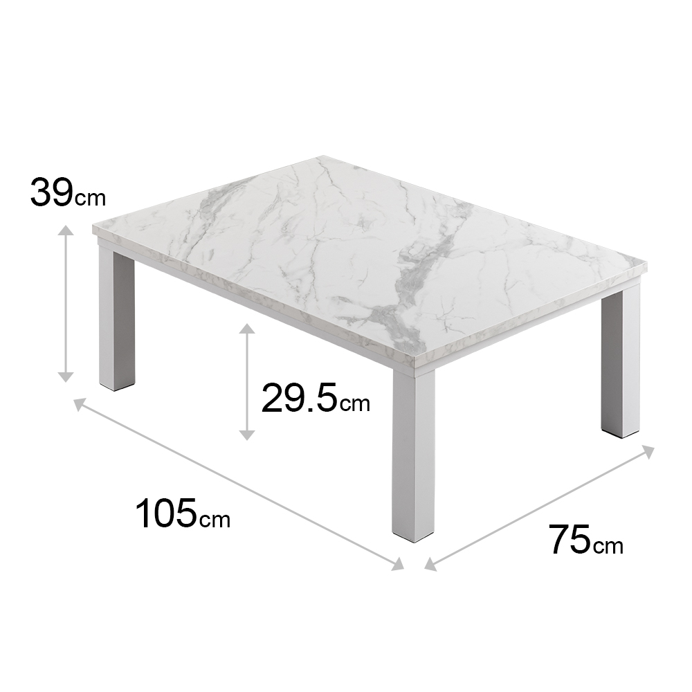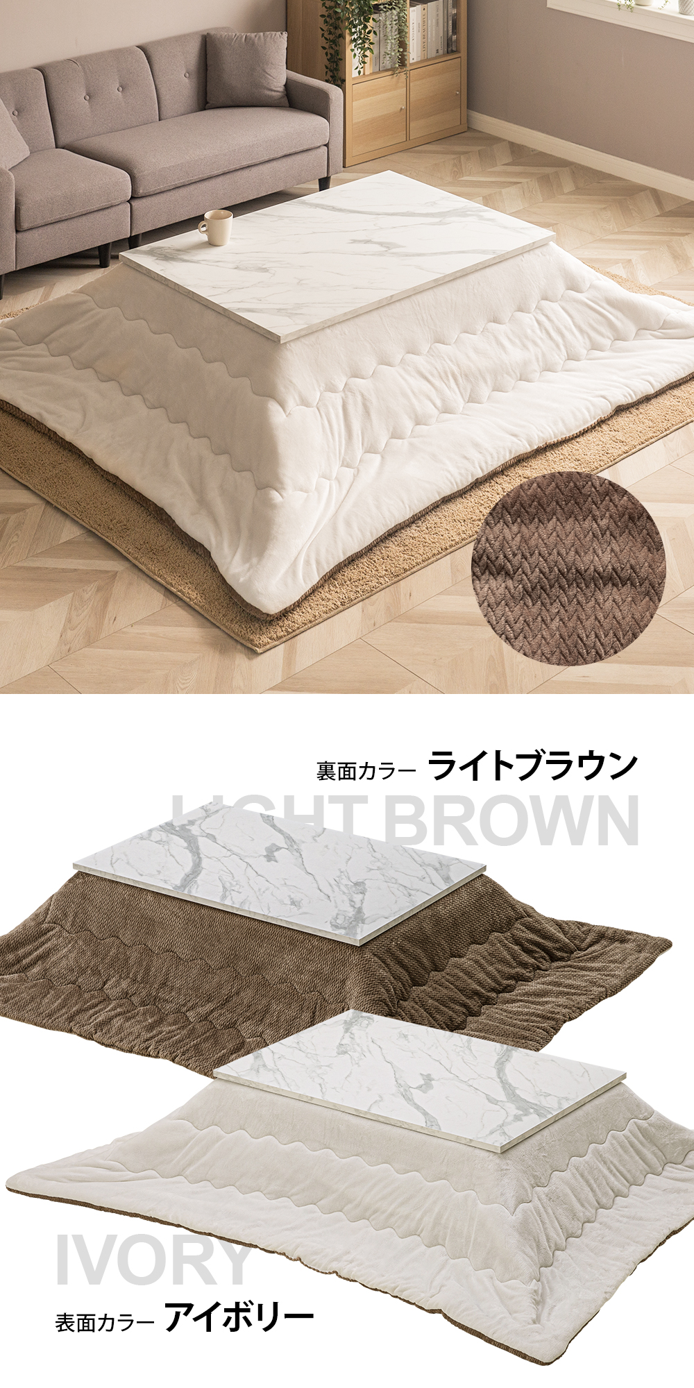 大理石柄のデザインと直線的でシンプルなフォルムが、上品でモダンな印象を与えるこたつです。