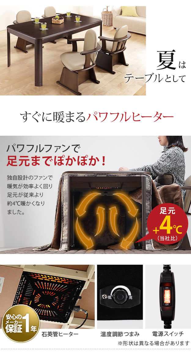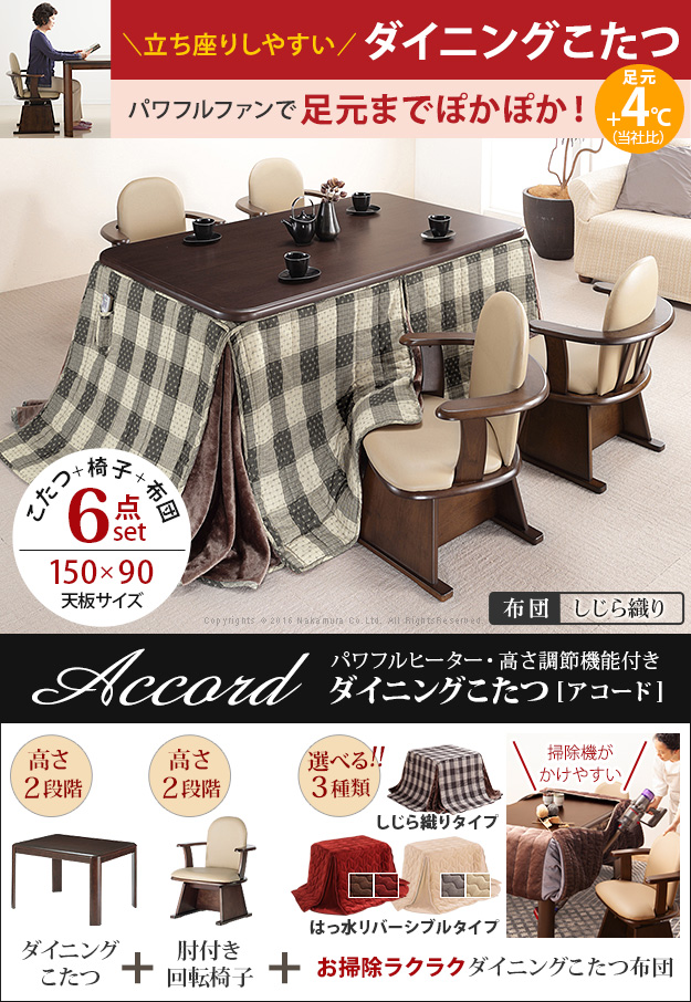こたつ 長方形 テーブル パワフルヒーター-高さ調節機能付き ダイニングこたつ-アコード150x90cm 6点セット(こたつ+掛布団+肘付回転椅子4脚) テレワーク