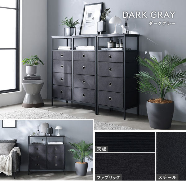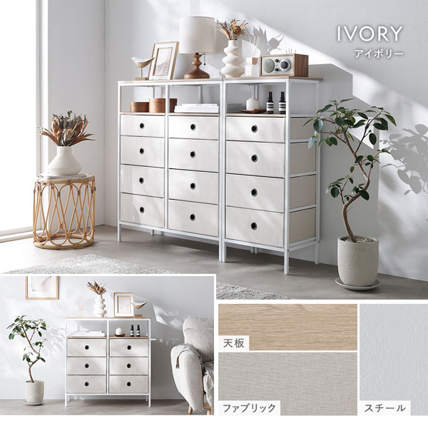 引き出し:外側:ファブリック(ポリエステル)、内側:不織布(芯材:MDF、厚紙)、取っ手:スチール
