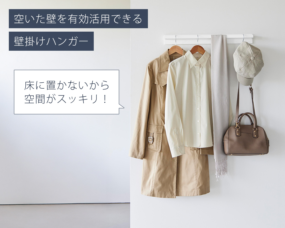 床に置かず、壁を使って収納できる「浮かせる収納」。限られたスペースでも圧迫感なく、玄関や廊下などの空き壁を有効活用できます。