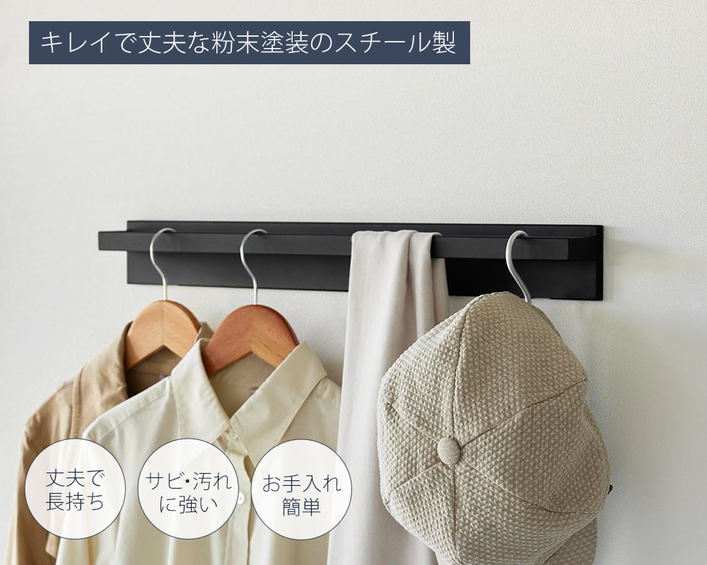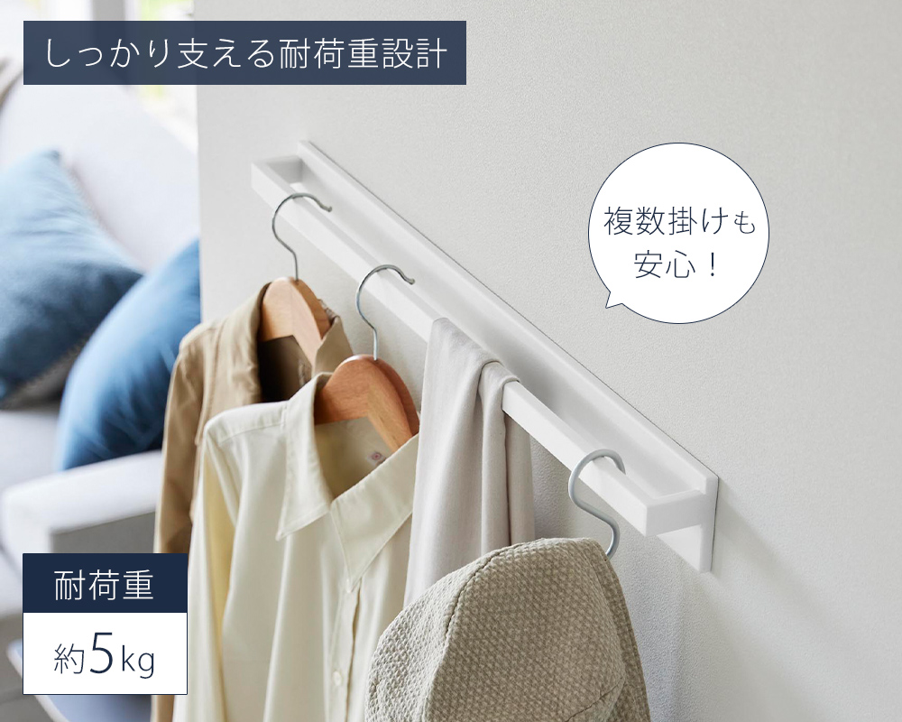 耐荷重は約5kg。 複数の衣類やバッグ、小物を掛けても安心して使える強度で、日常使いに十分な安定感があります。