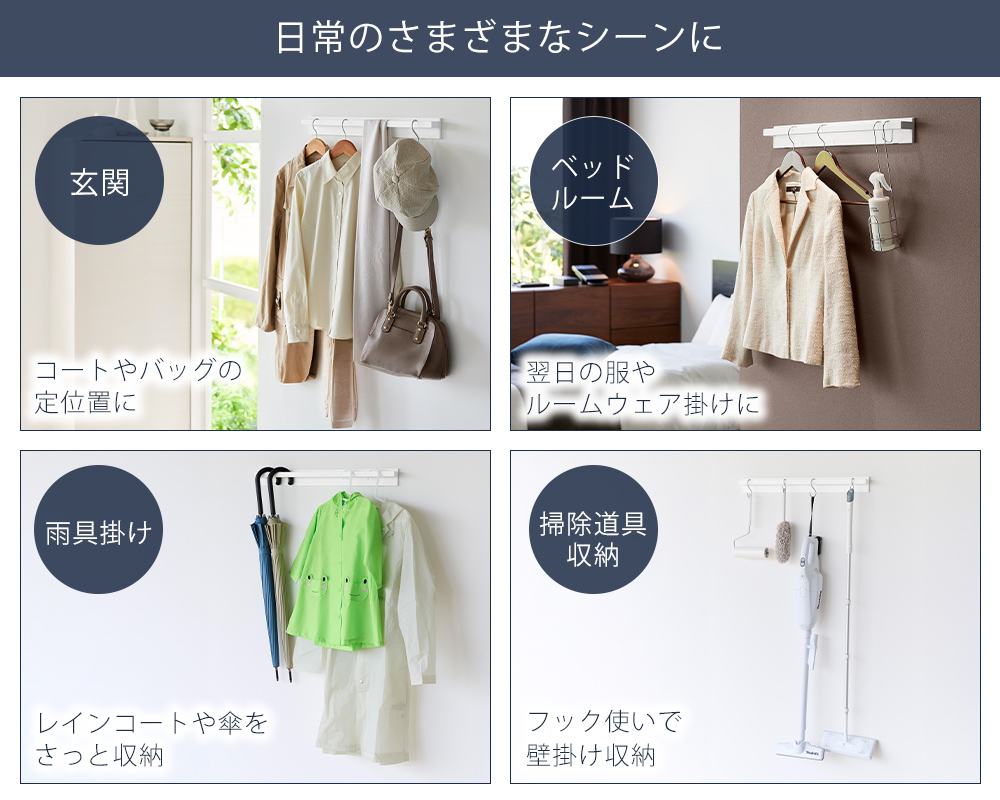 玄関や寝室、雨具掛けや掃除道具の収納まで。暮らしのシーンに合わせて、幅広く使えます。