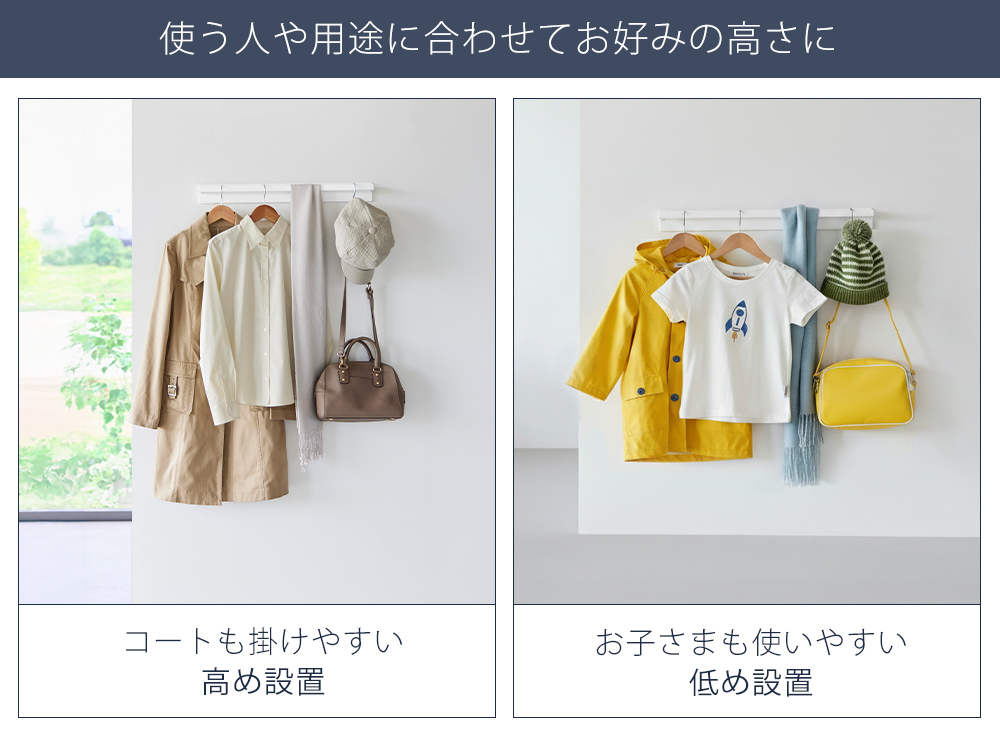 コートなど丈の長い衣類が掛けやすい高め設置から、お子さまでも手が届く低め設置まで。暮らしや使う人に合わせて、好みの高さに取り付けできます。