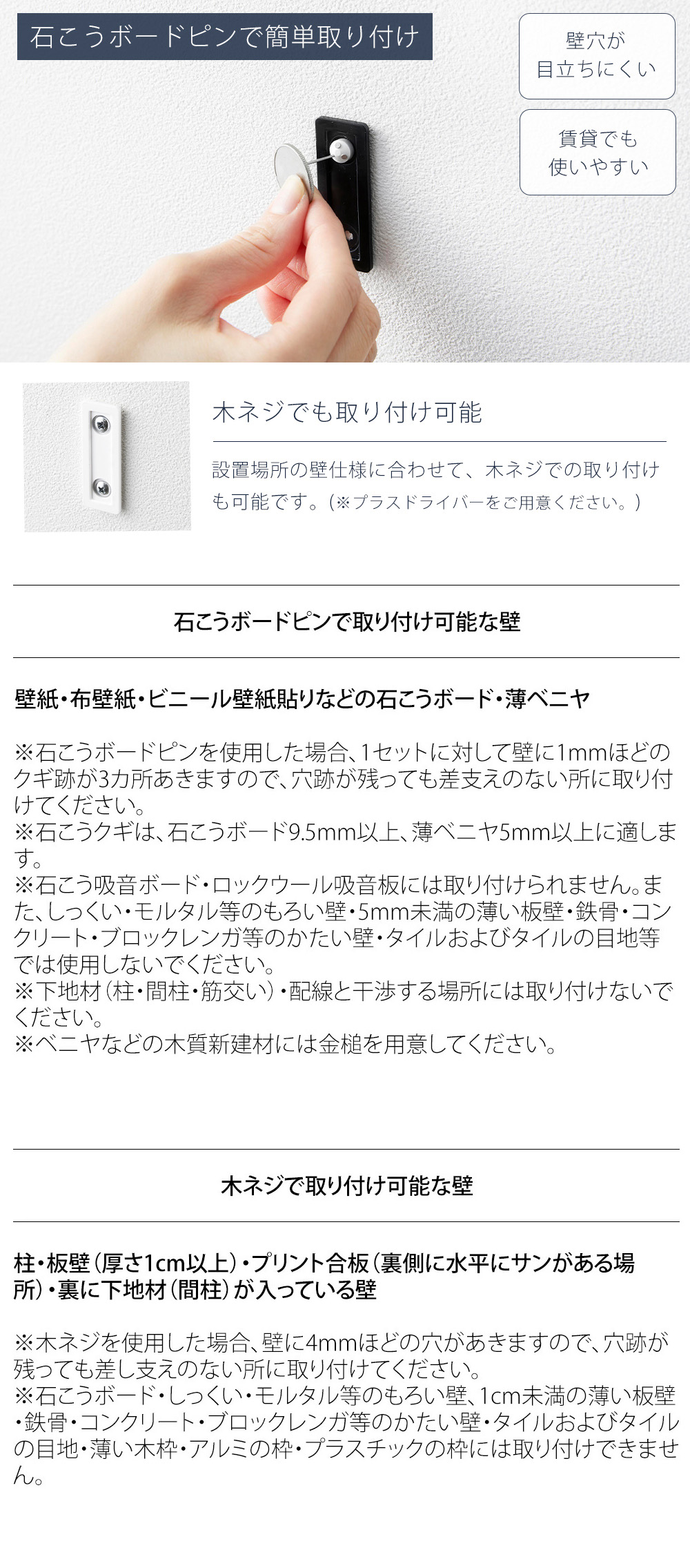石こうボードピンで簡単に取り付けでき、ピン跡が小さく目立ちにくいため、賃貸住宅でも使いやすい取り付け方法です。