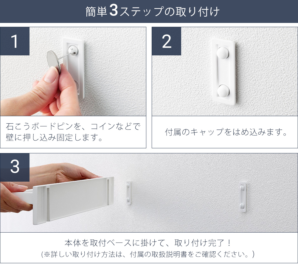 まず、取り付けベースを石こうボードピンをコインなどで押し込んで固定します。次に、付属のキャップをはめ込んでピンをカバー。最後に本体を取り付けベースに掛ければ設置完了です。